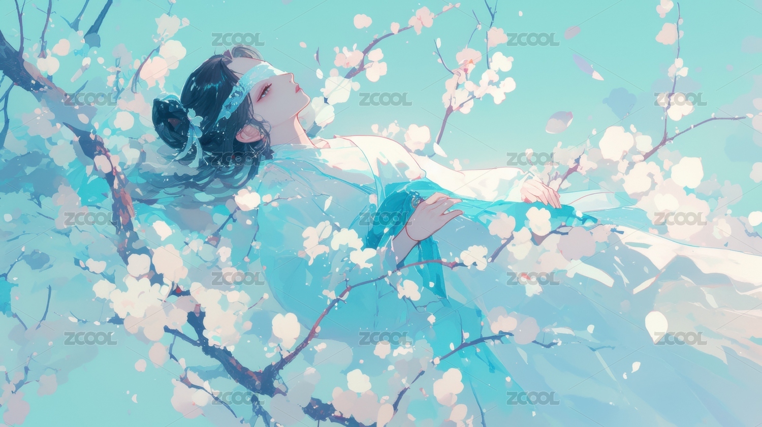 插画,绘画,水彩,氛围,梦幻,宁静,蓝色,少女,女孩,浪漫