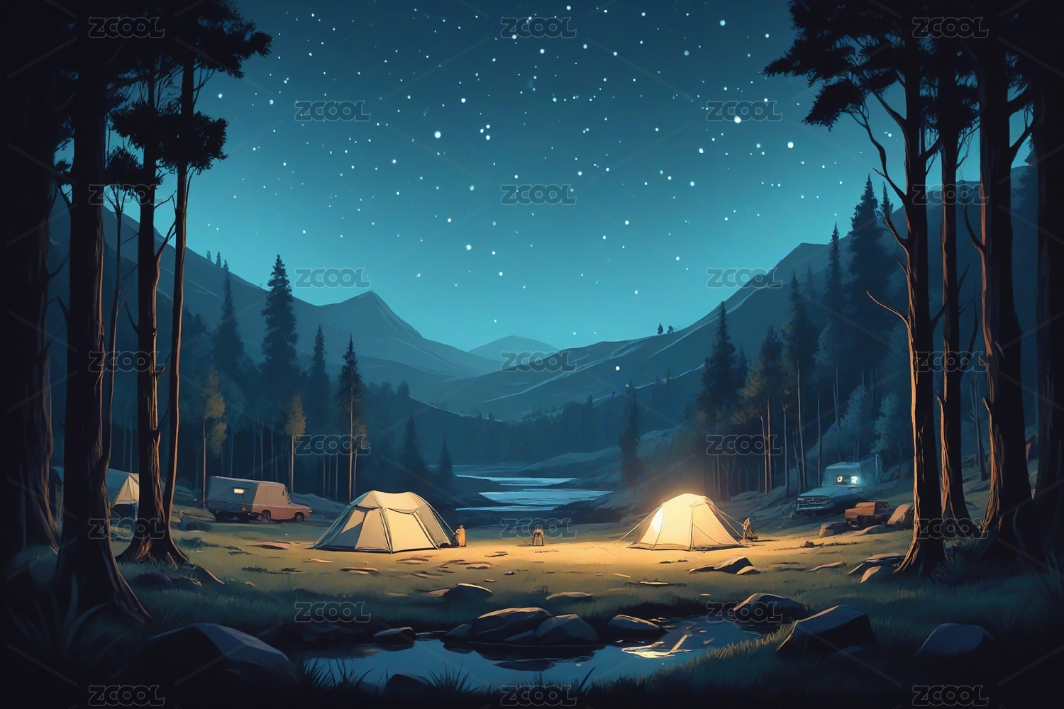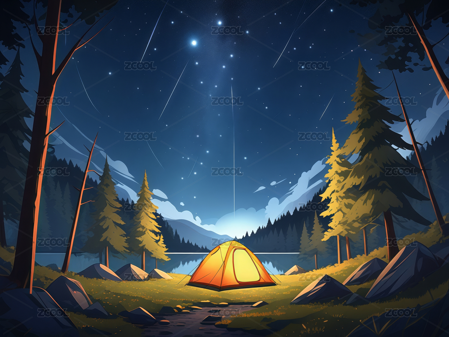 户外,夜景,夜晚,草坪上,帐篷,天幕,烧烤,露营,野营,双峰