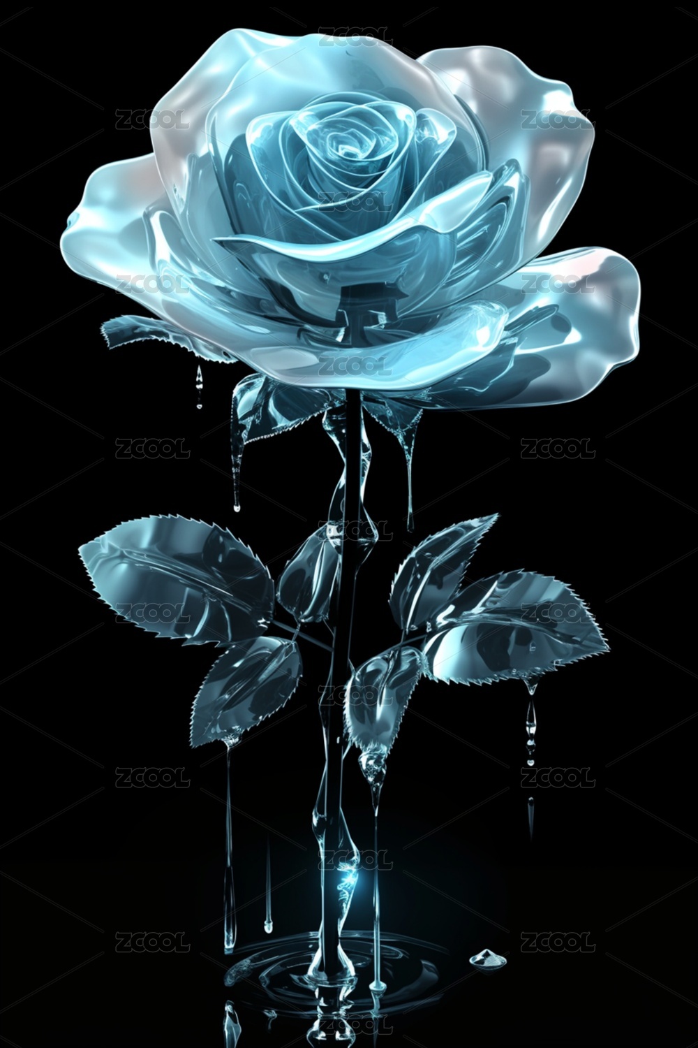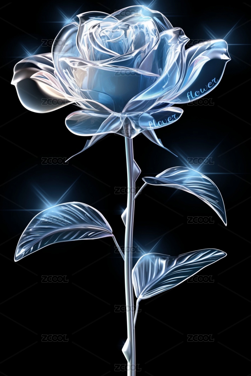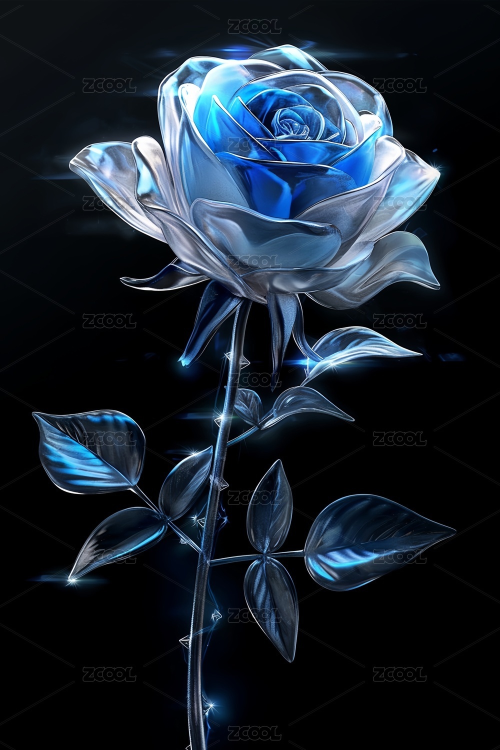 3D立体透明玻璃三维质感光感蓝玫瑰花
