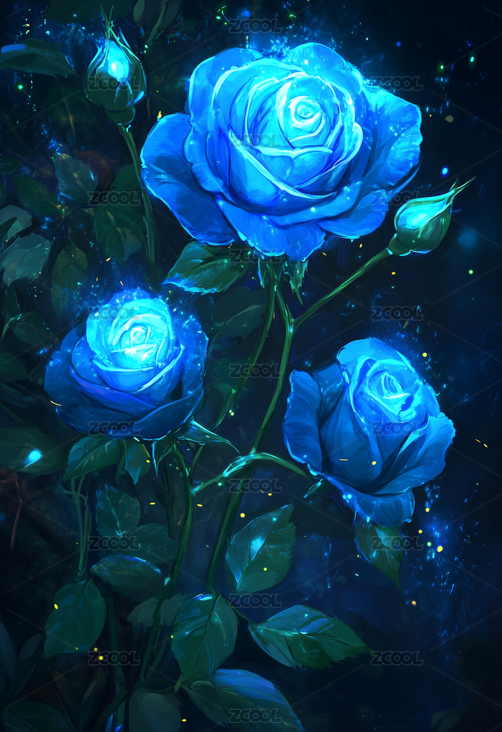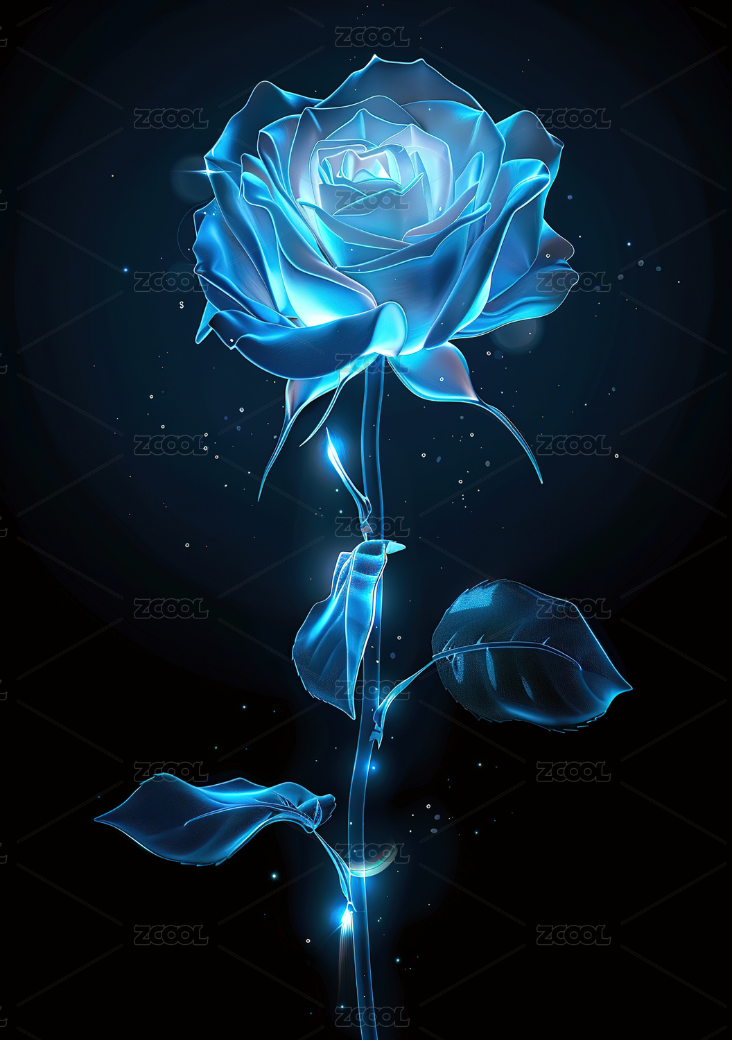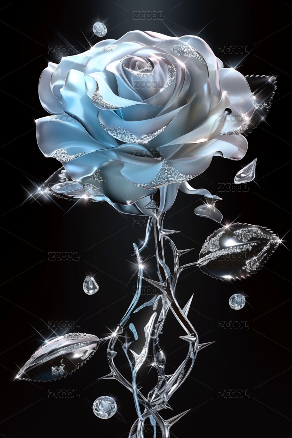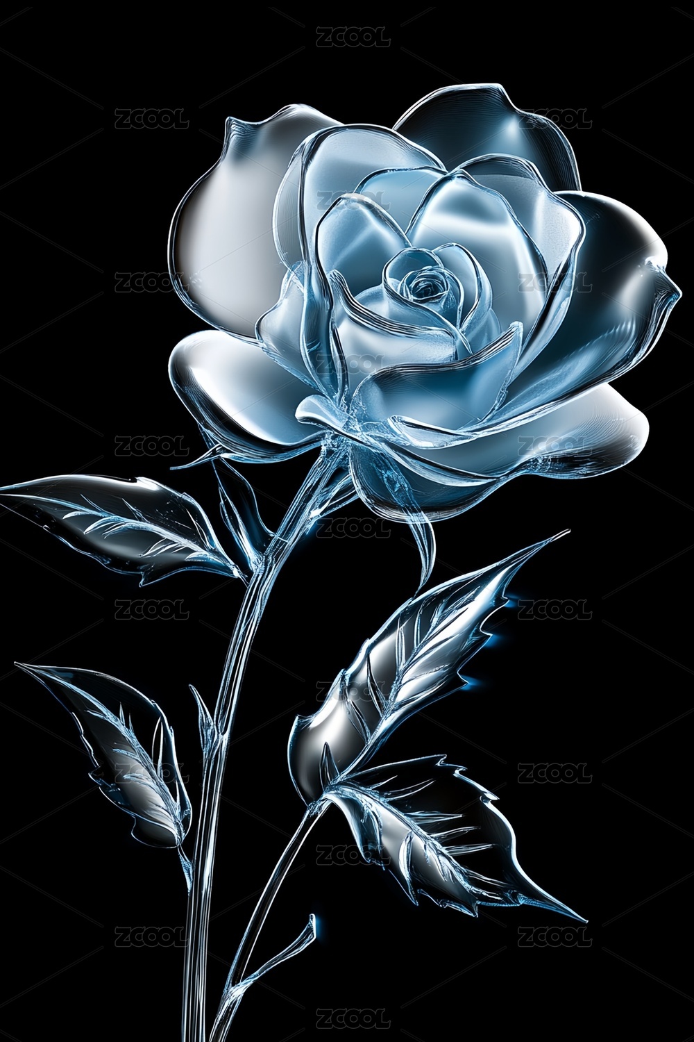 3D立体透明玻璃三维质感光感蓝玫瑰花