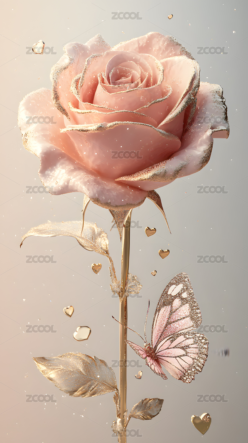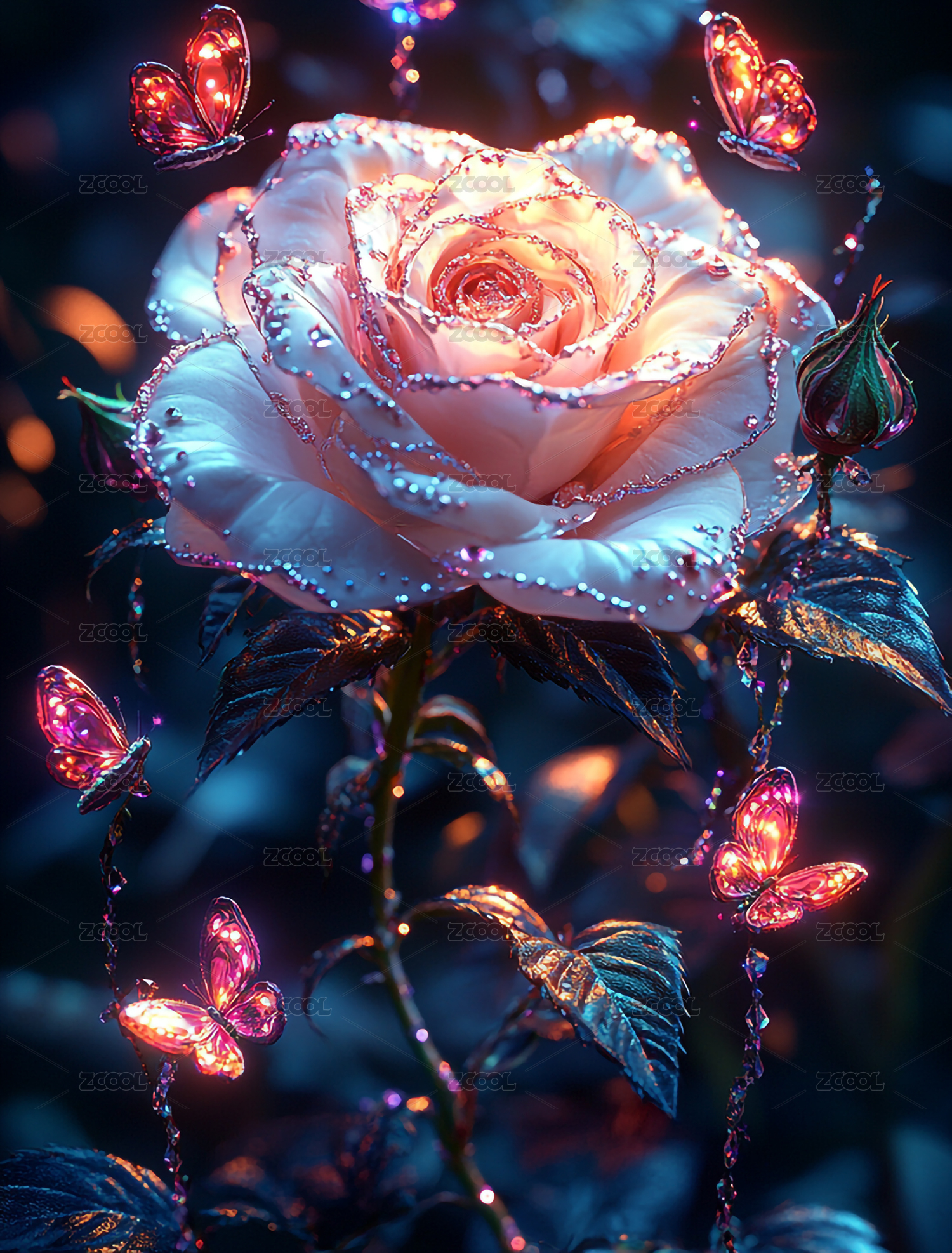 蓝色蝴蝶与粉色玫瑰的梦幻场景