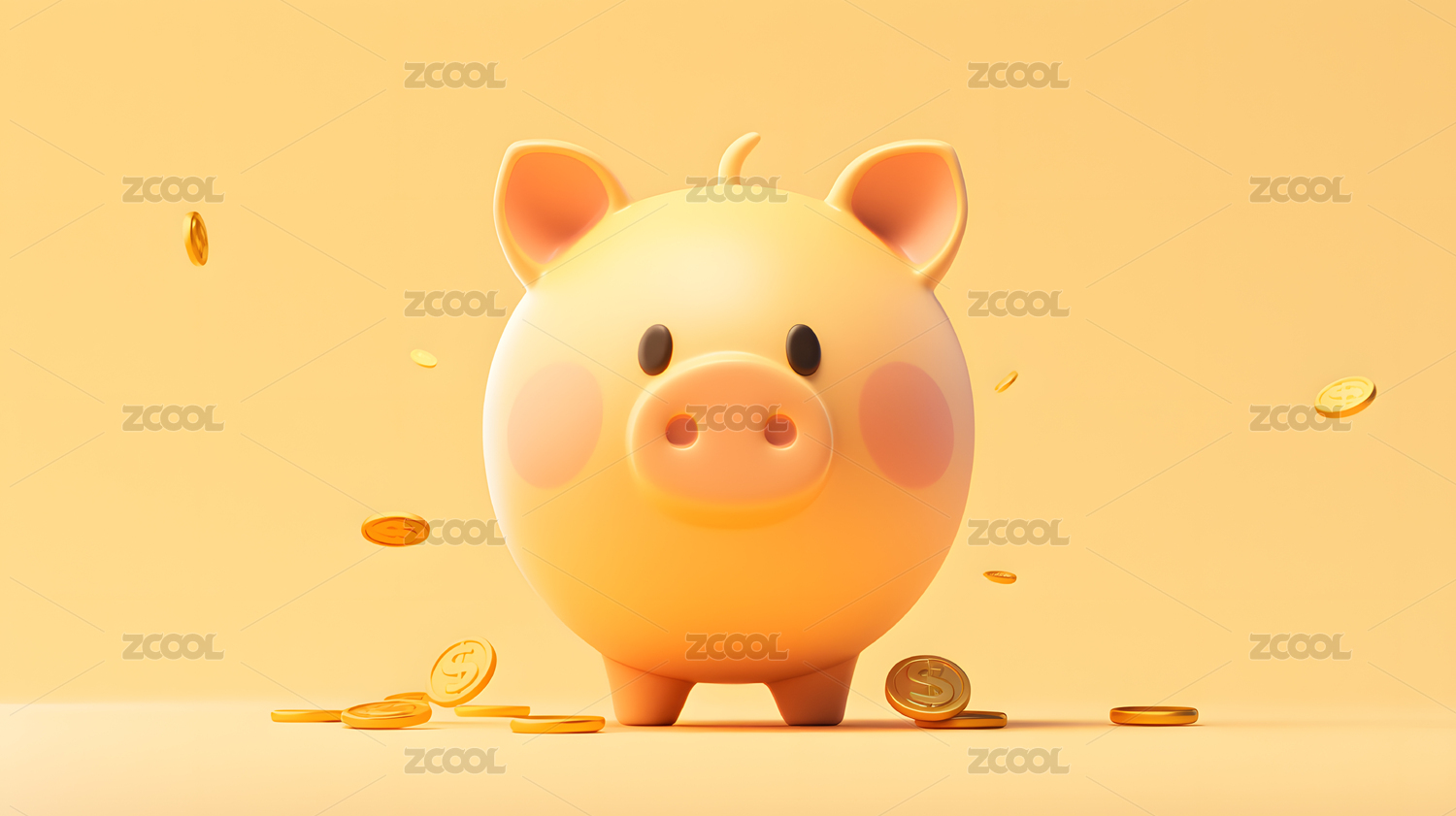 黄色背景上飘散的金币和粉色小猪存钱罐