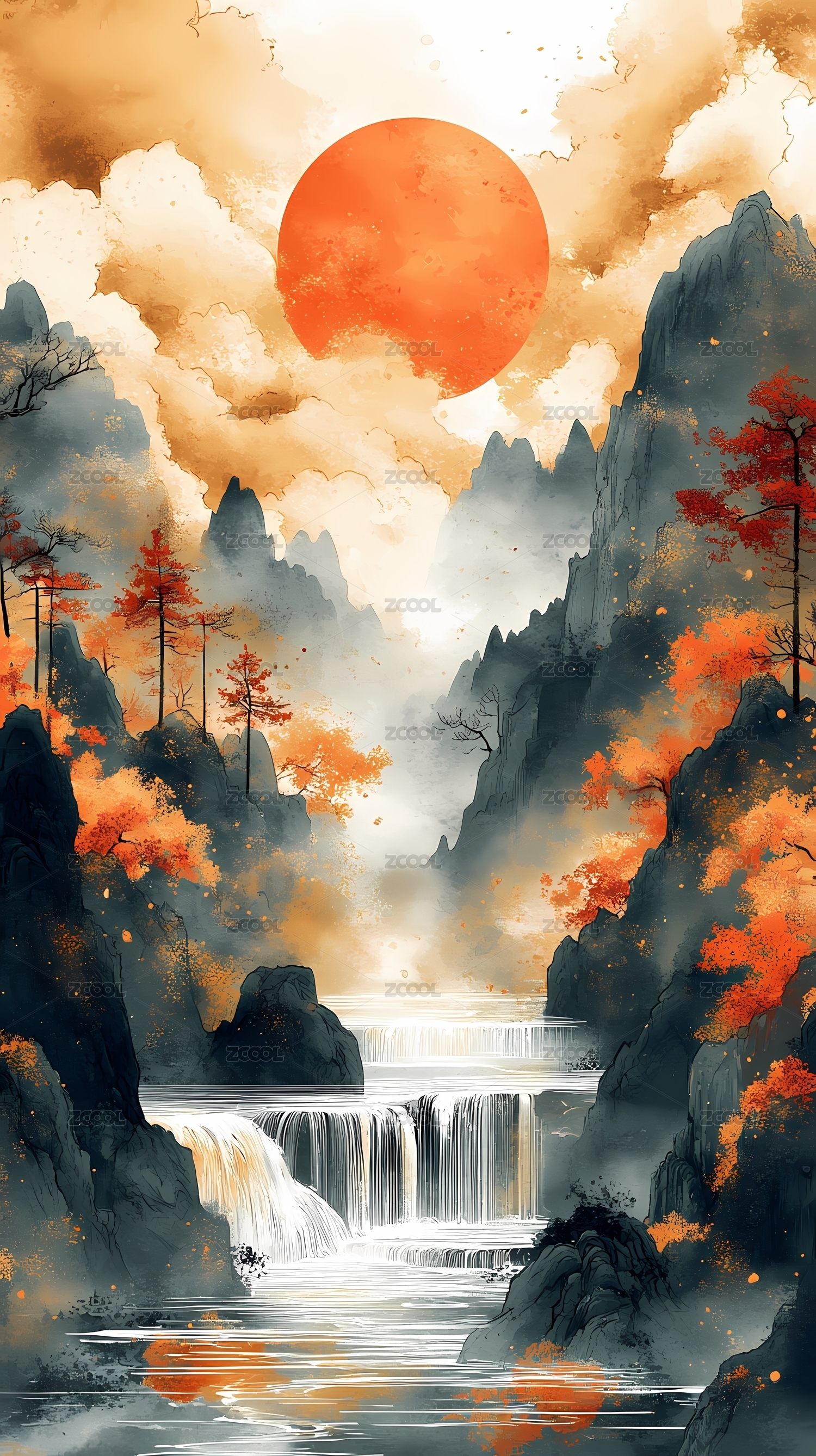 粉色,花,树,蓝色,紫色,山,瀑布,橙色,月亮,插画