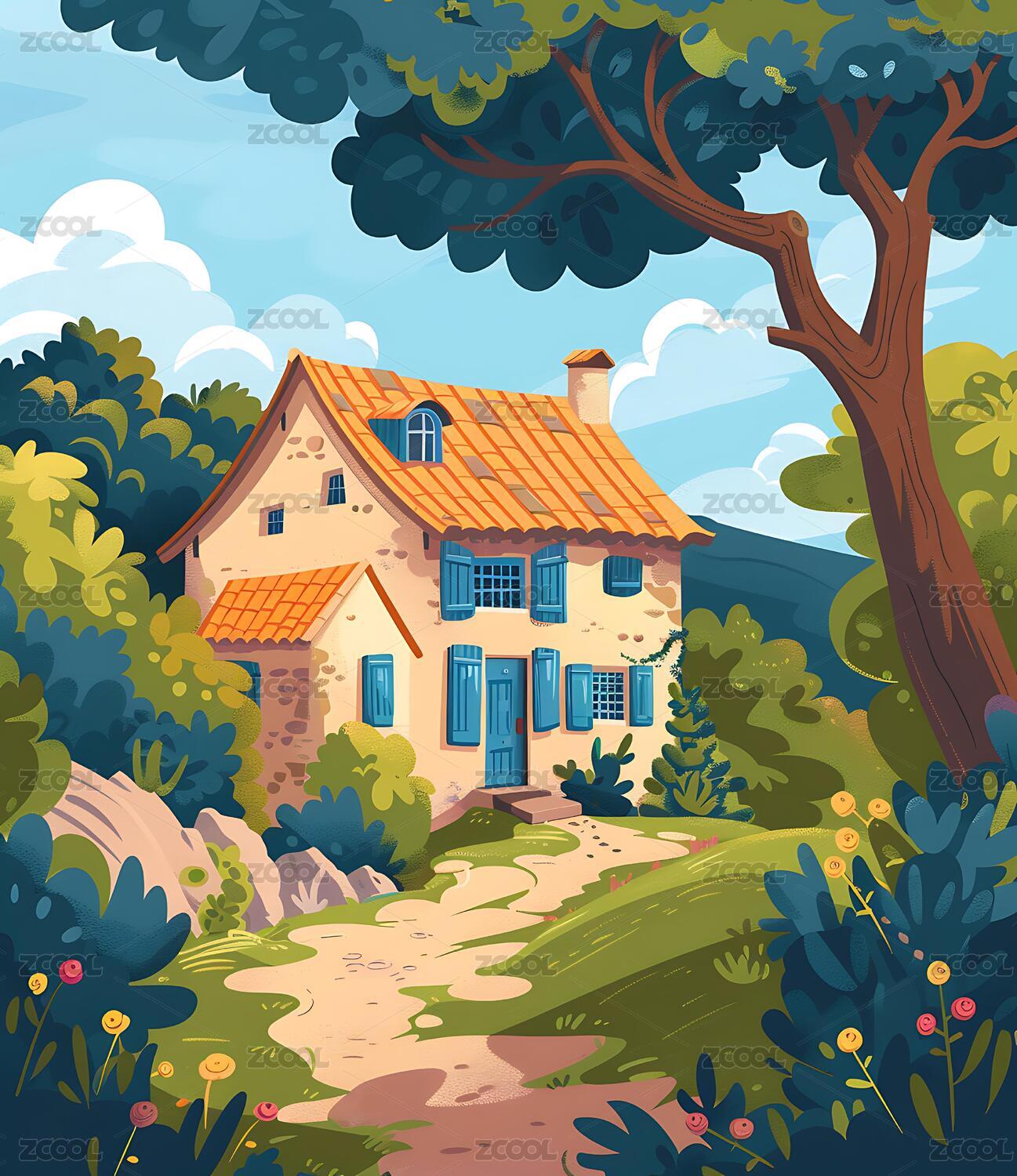 户外乡村房屋小清新风景插画
