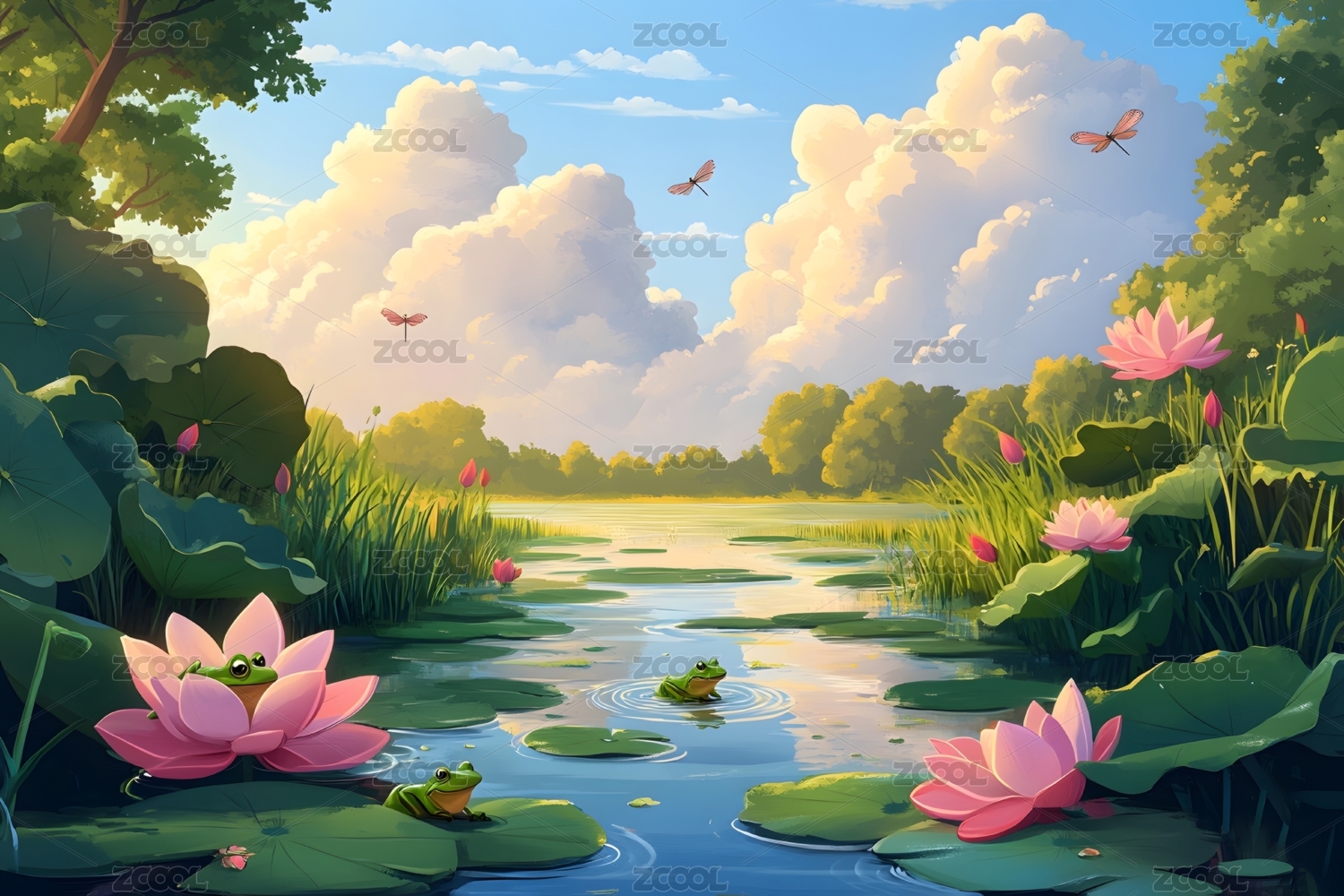 夏日沼泽中的翠绿荷叶与跳跃青蛙