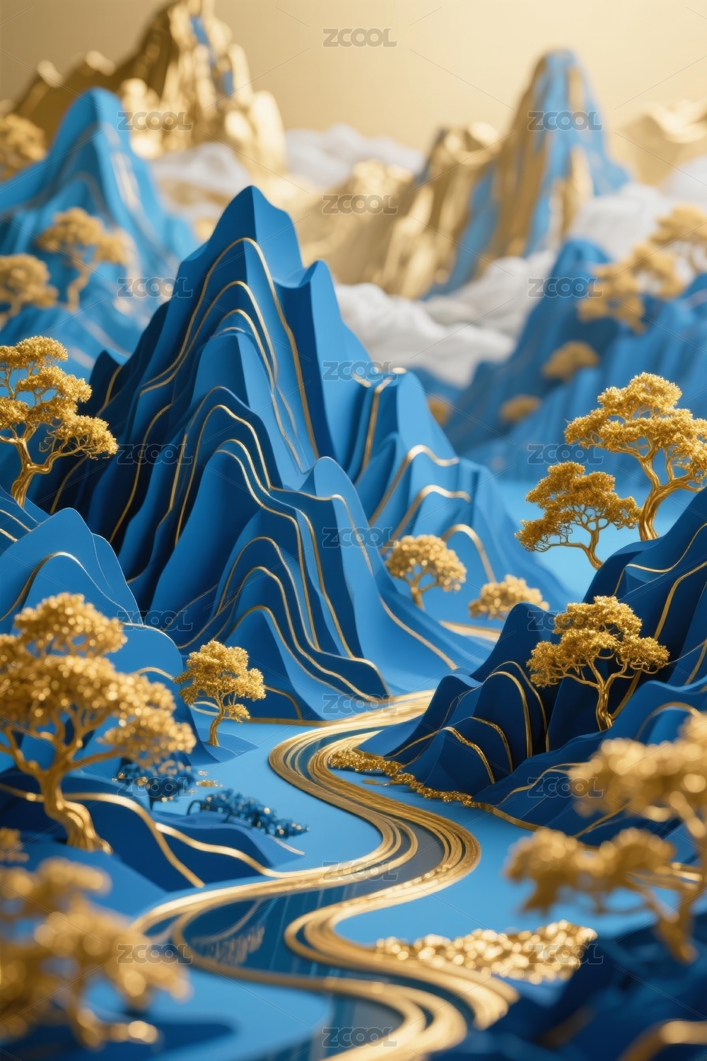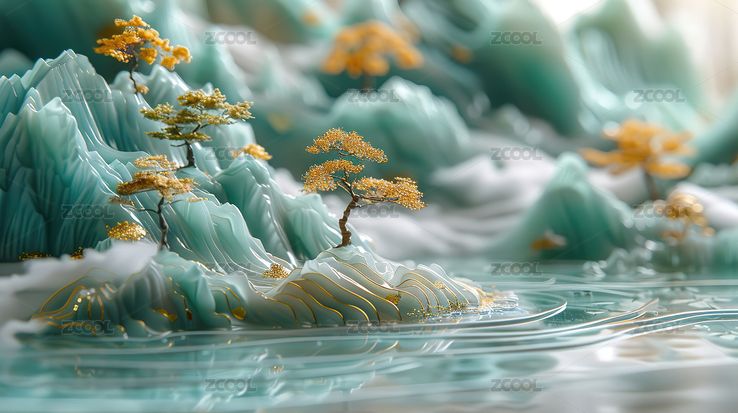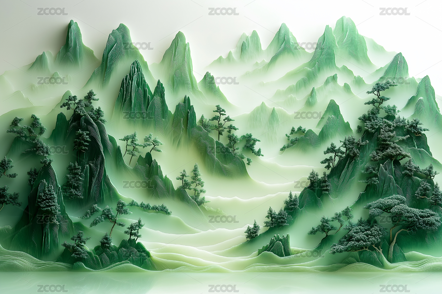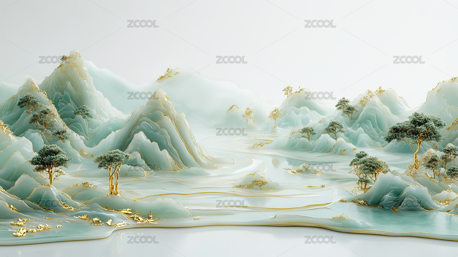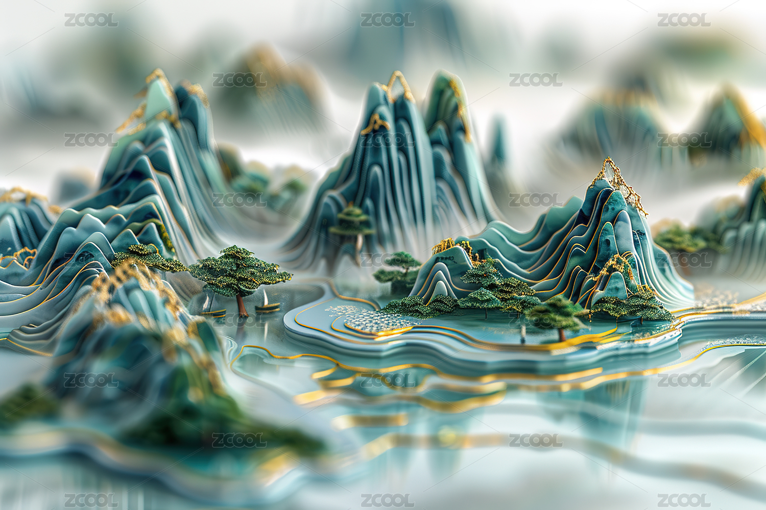 艺术,中国,山水,画,河,山,自然,蓝色,绿色,插画