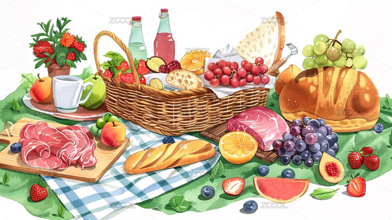 桌子上丰盛的俄罗斯美食午餐厚涂油画插画