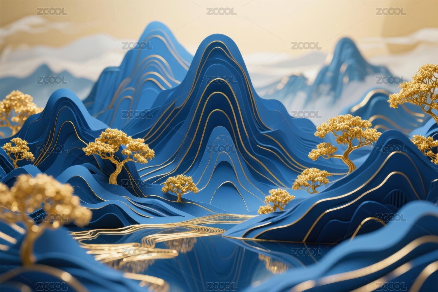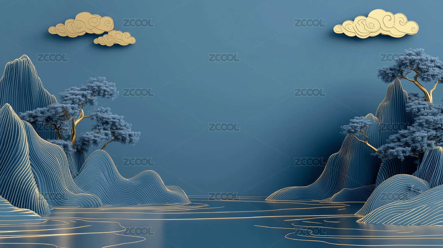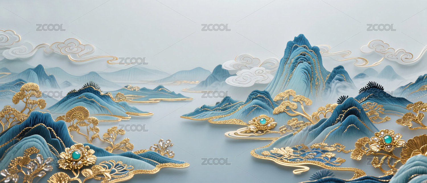 创意立体蓝金色国风山水背景