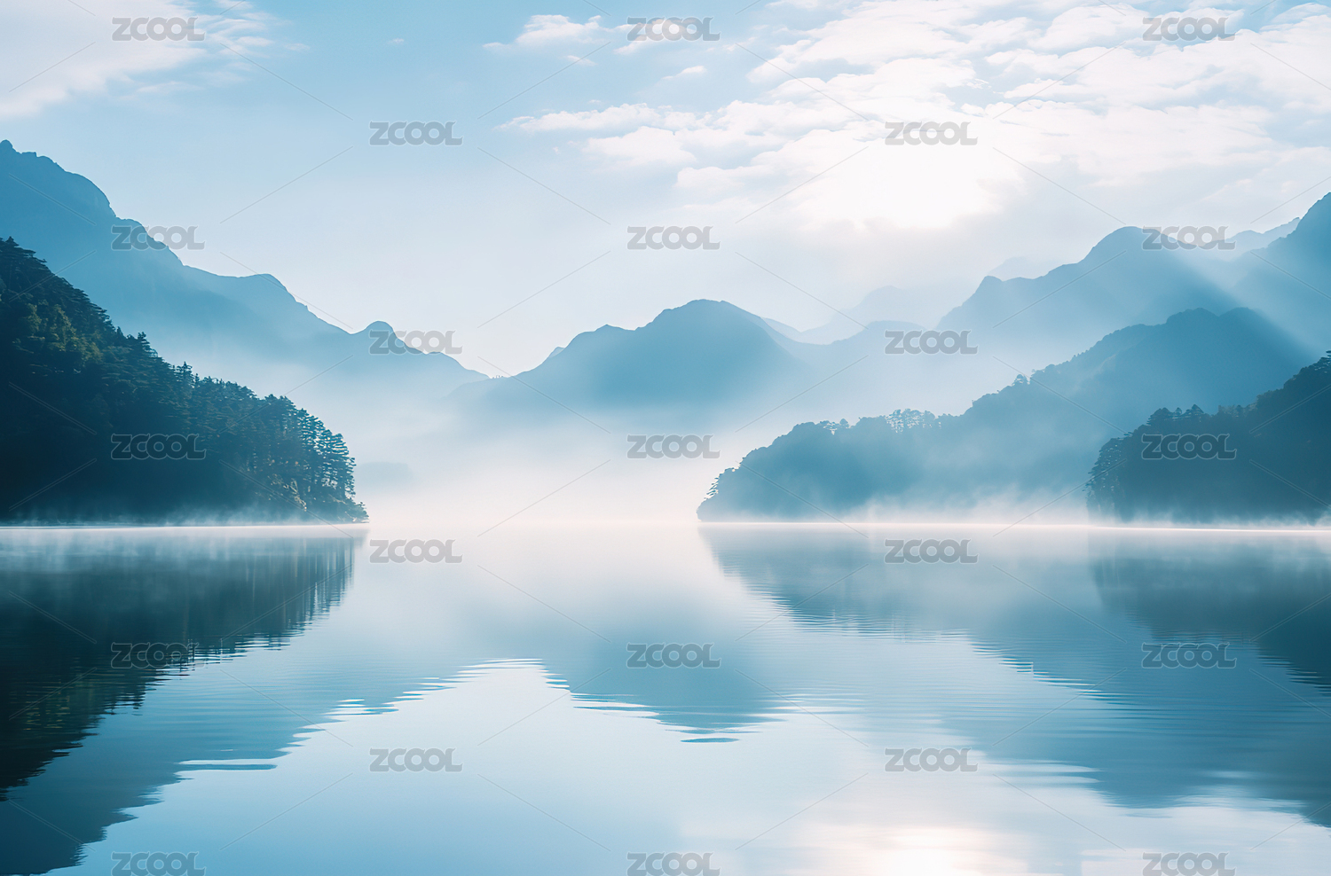 晨雾轻绕湖面阳光穿透树林倒影如画