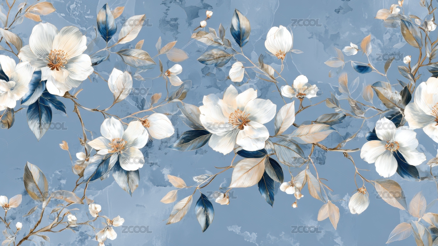 蓝白玉兰花枝叶图案