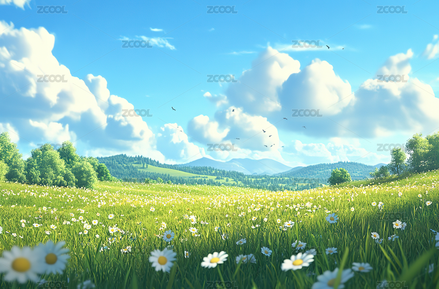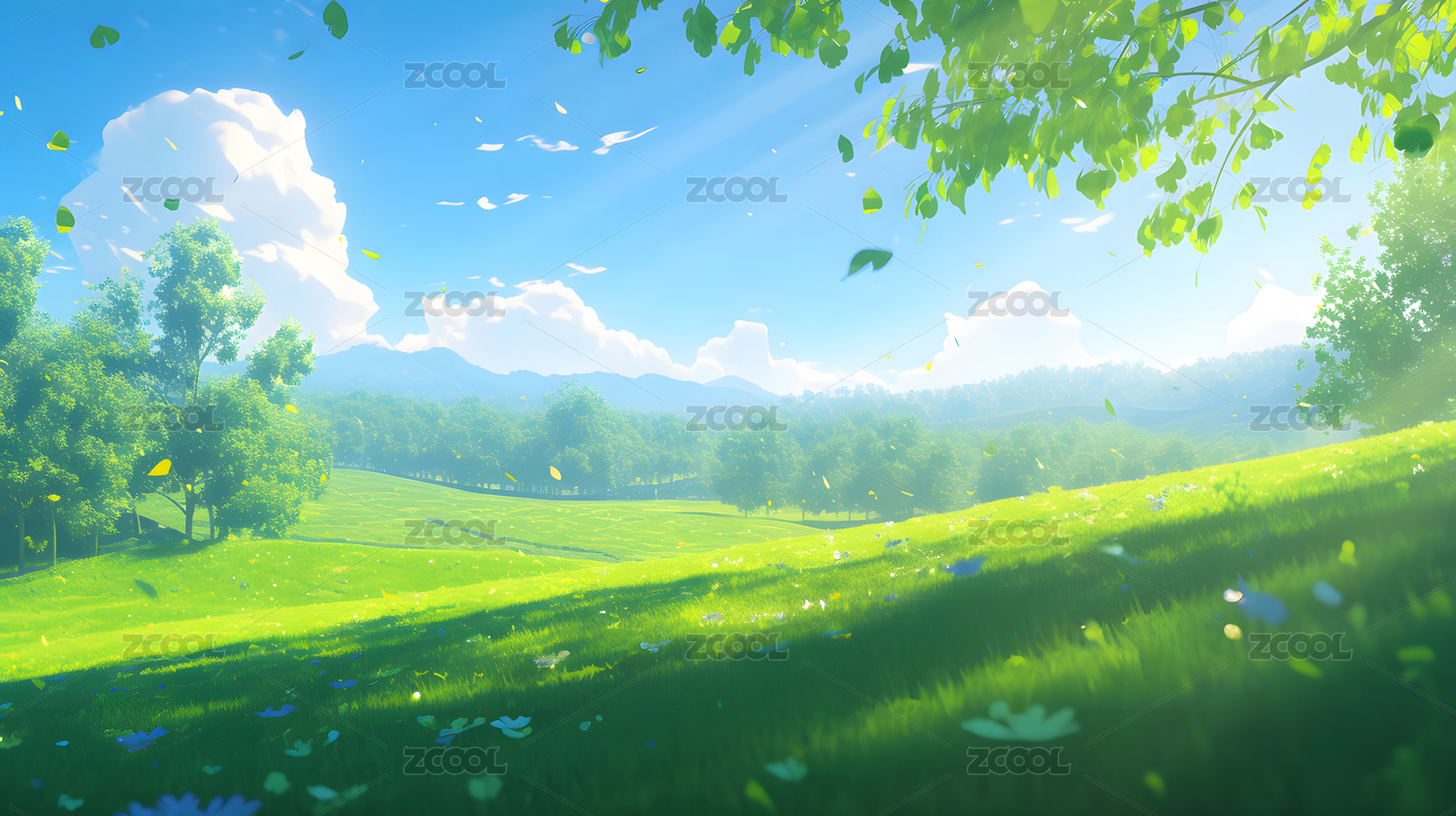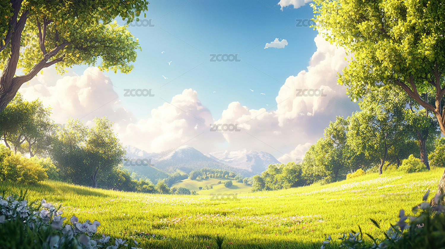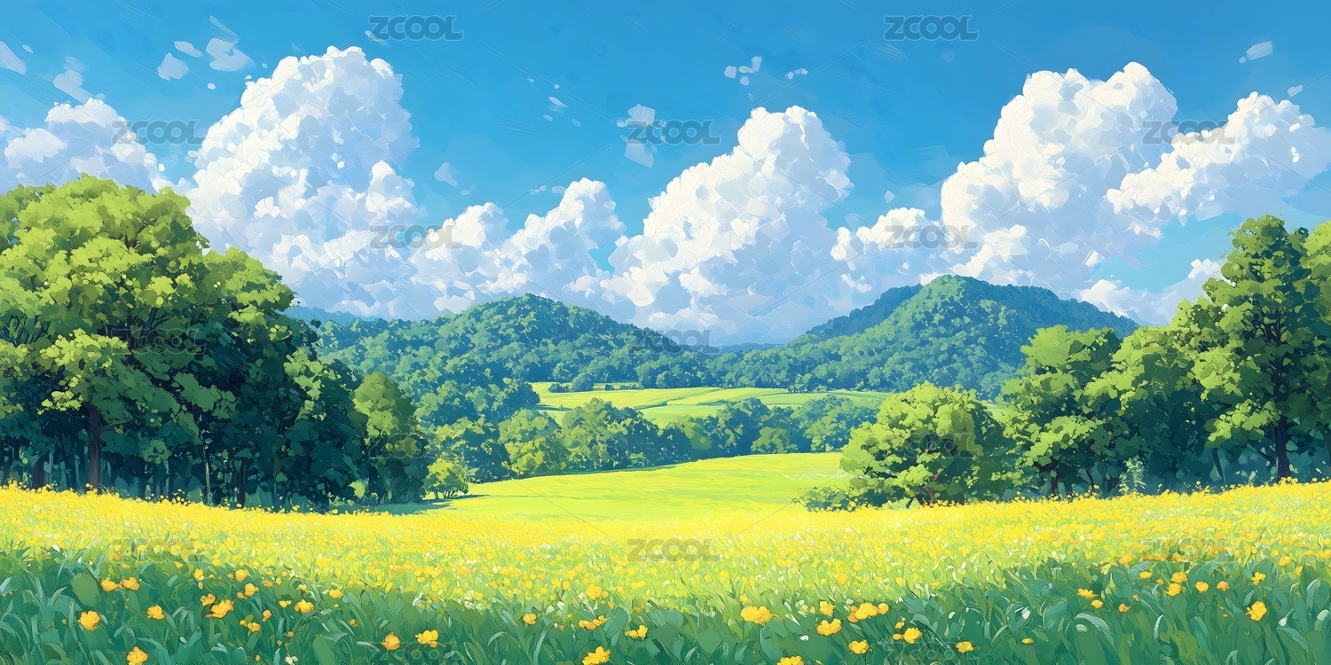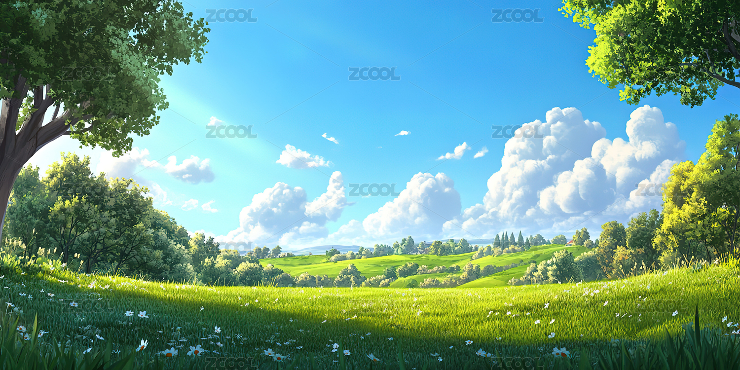 蓝天白云草地绿色鲜花大树插画风景壁纸