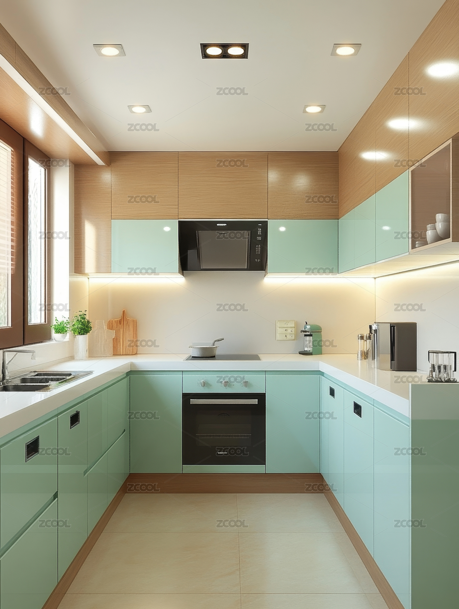 厨房,橱柜,烤箱,植物,窗户,现代,绿色,木质,整洁,光线