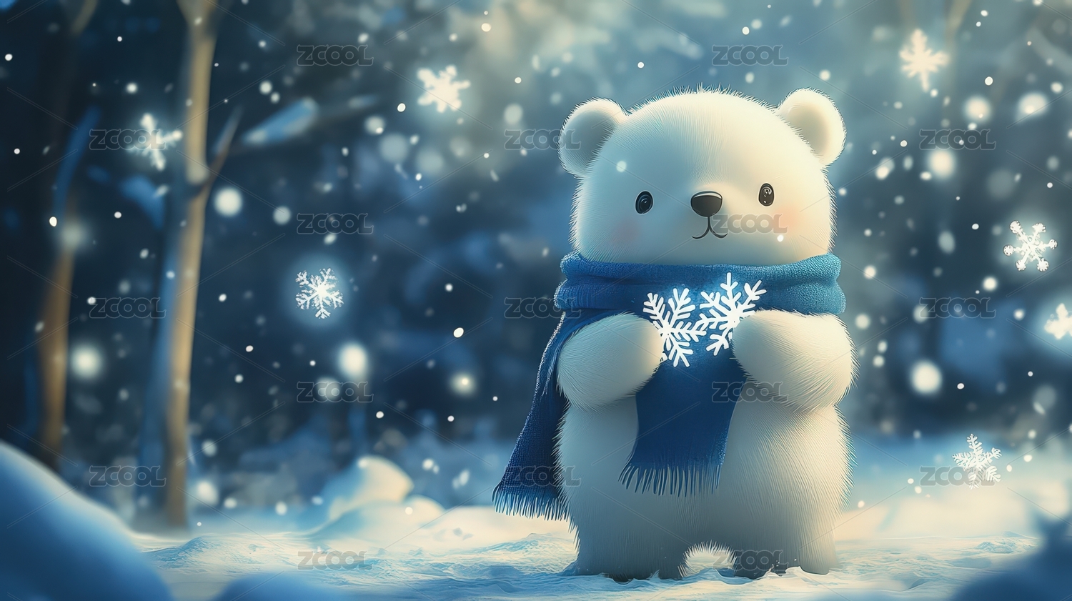 戴围巾的白色小熊与雪花