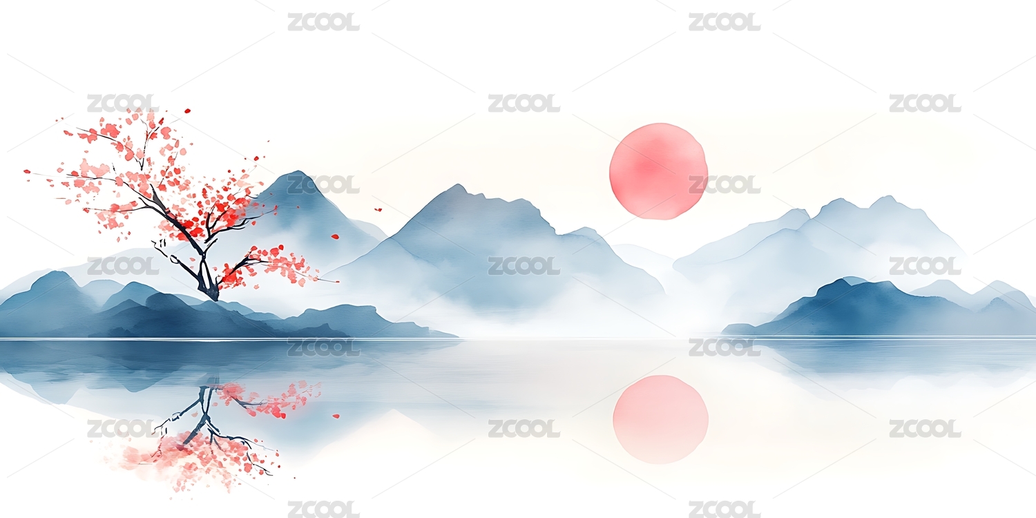 山峦红日水墨意境画