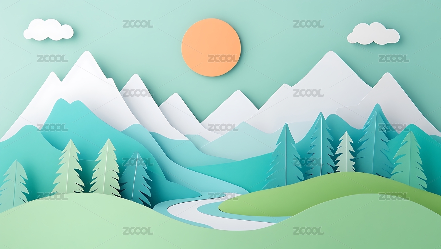 纸艺风格山川河流风景