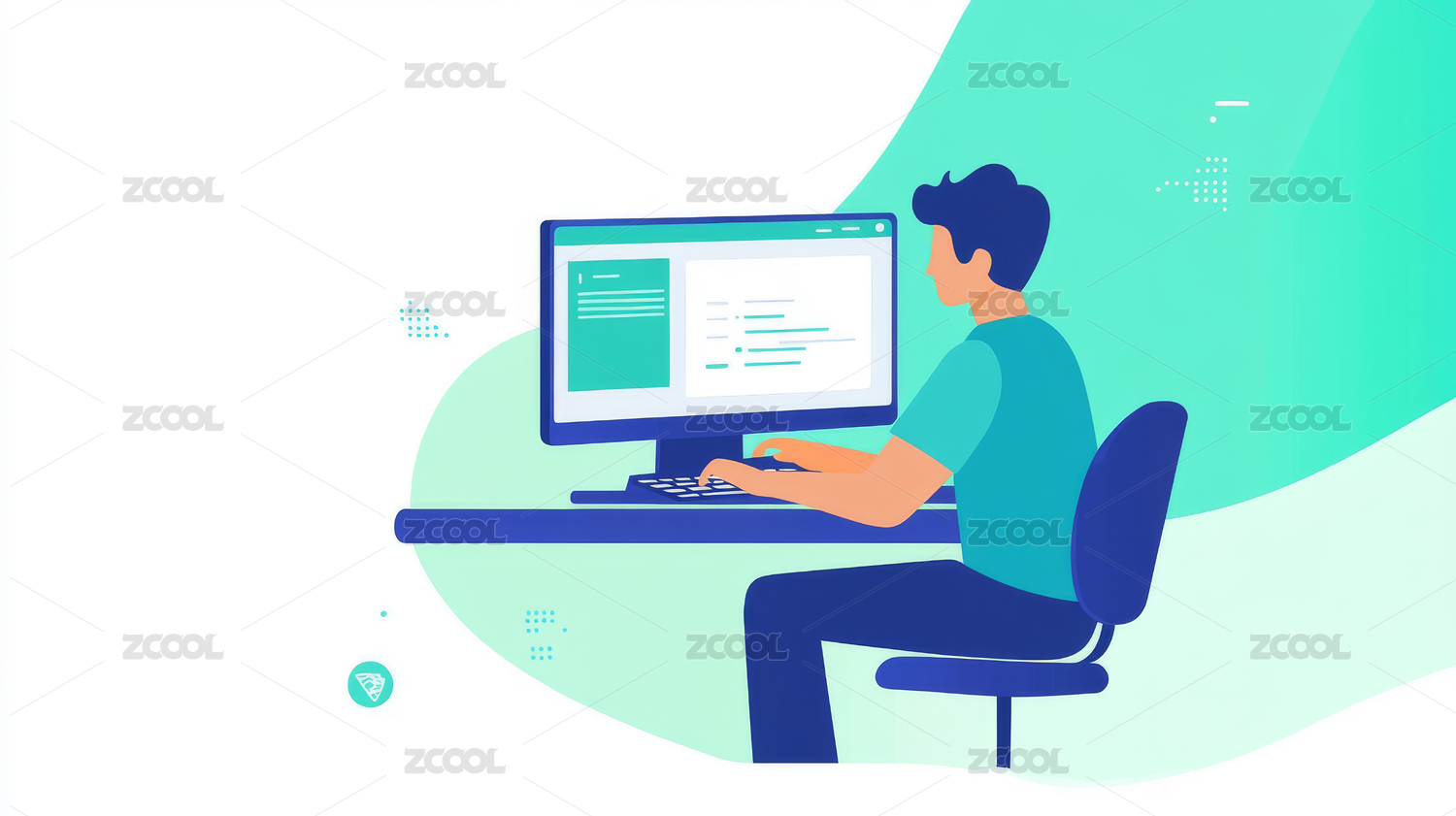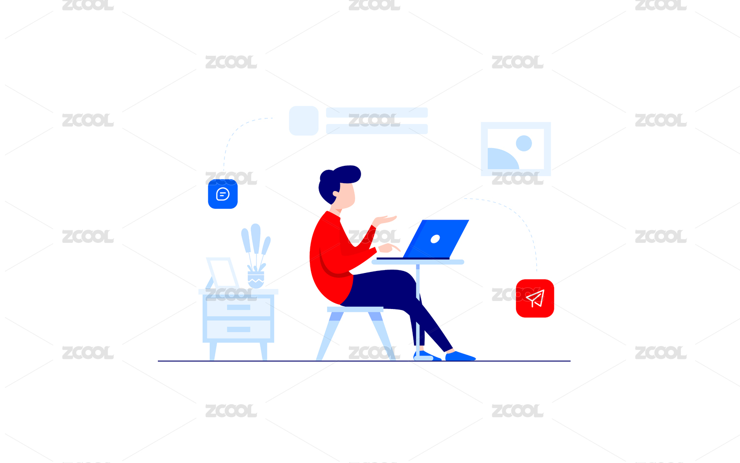 办公桌边 使用电脑办公聊天的加班的白领矢量海报插画背景坐在有飘窗的房间的办公桌前 使用电脑办公聊天的加班的白领矢量海报插画背景