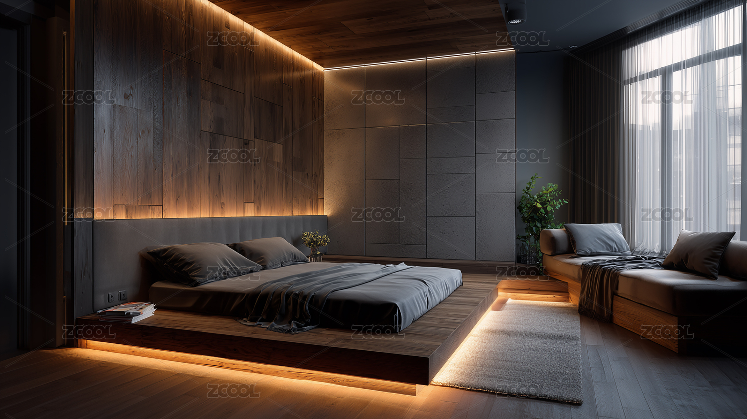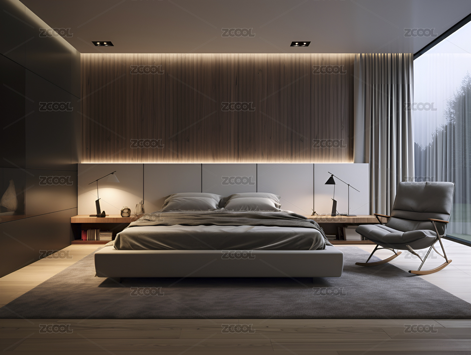 卧室,床,挂画,吊灯,绿植,地毯,落地窗,现代,家,设计