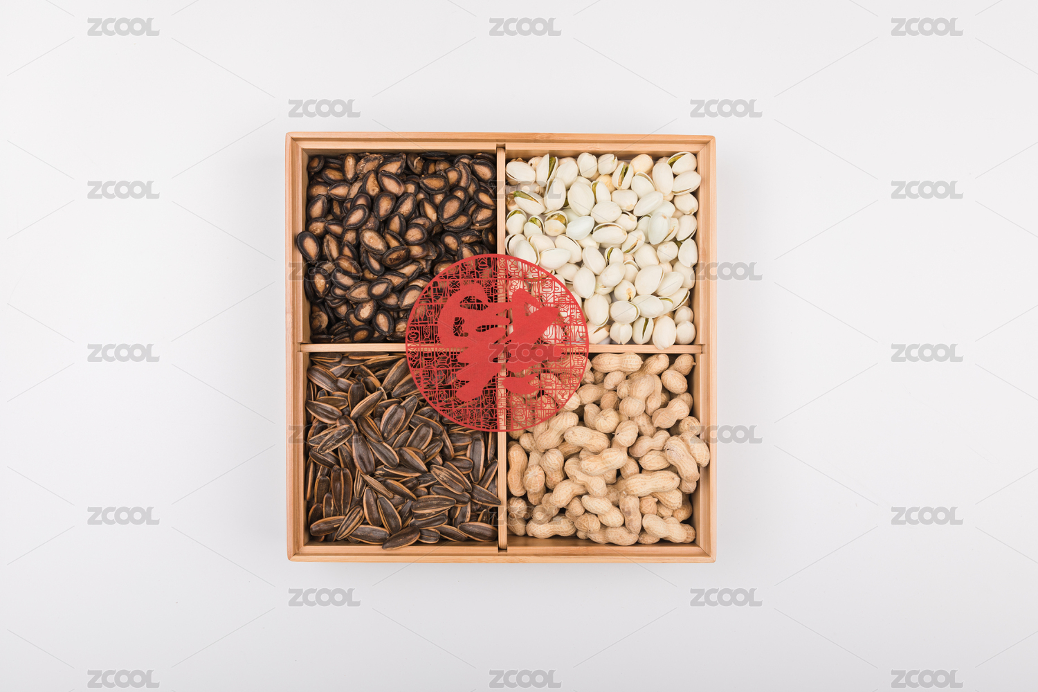 白色背景上放着一盒花生瓜子果盘拼盘