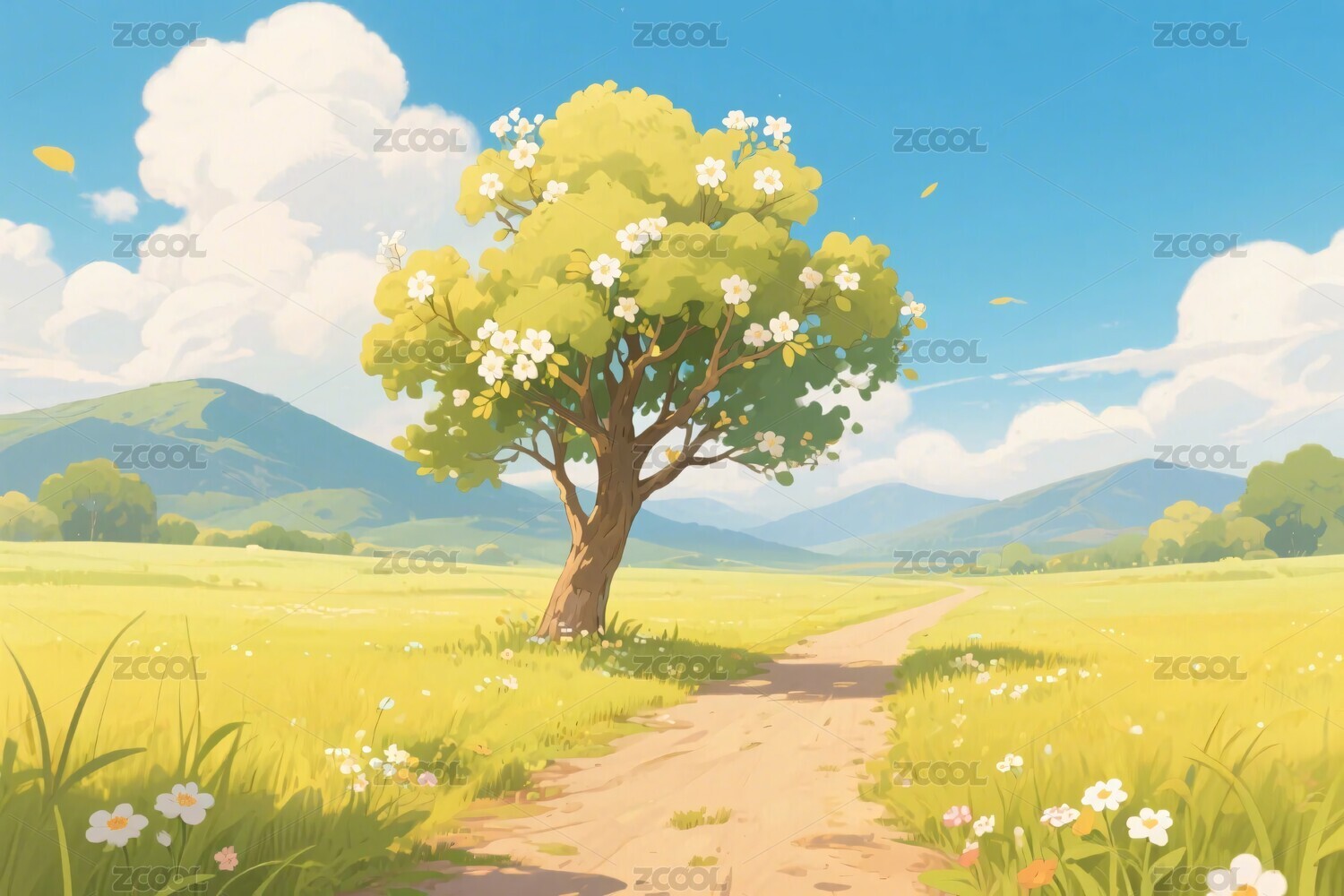 自然,黄色,美丽,宁静,蓝天,白云,山丘,绿色,草地,乡村
