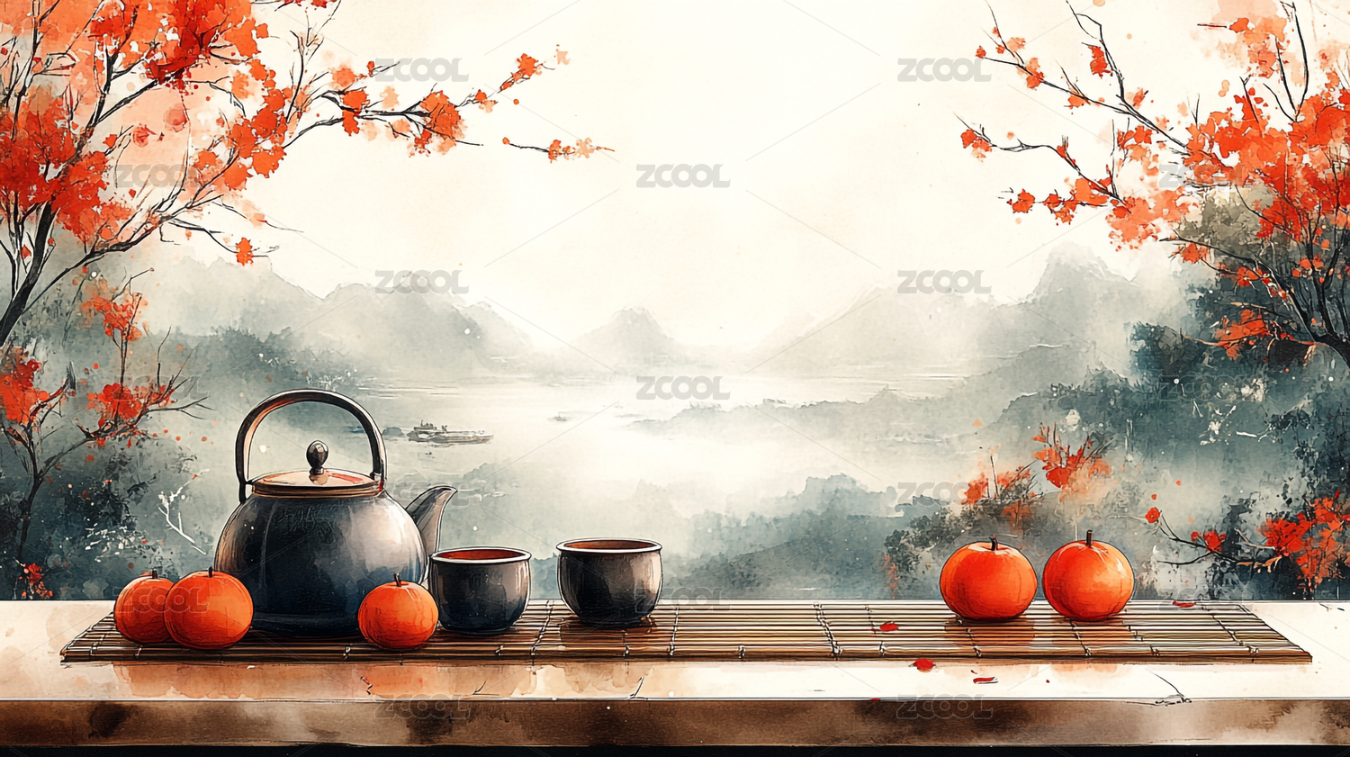 竹叶背景中的茶壶中国风场景