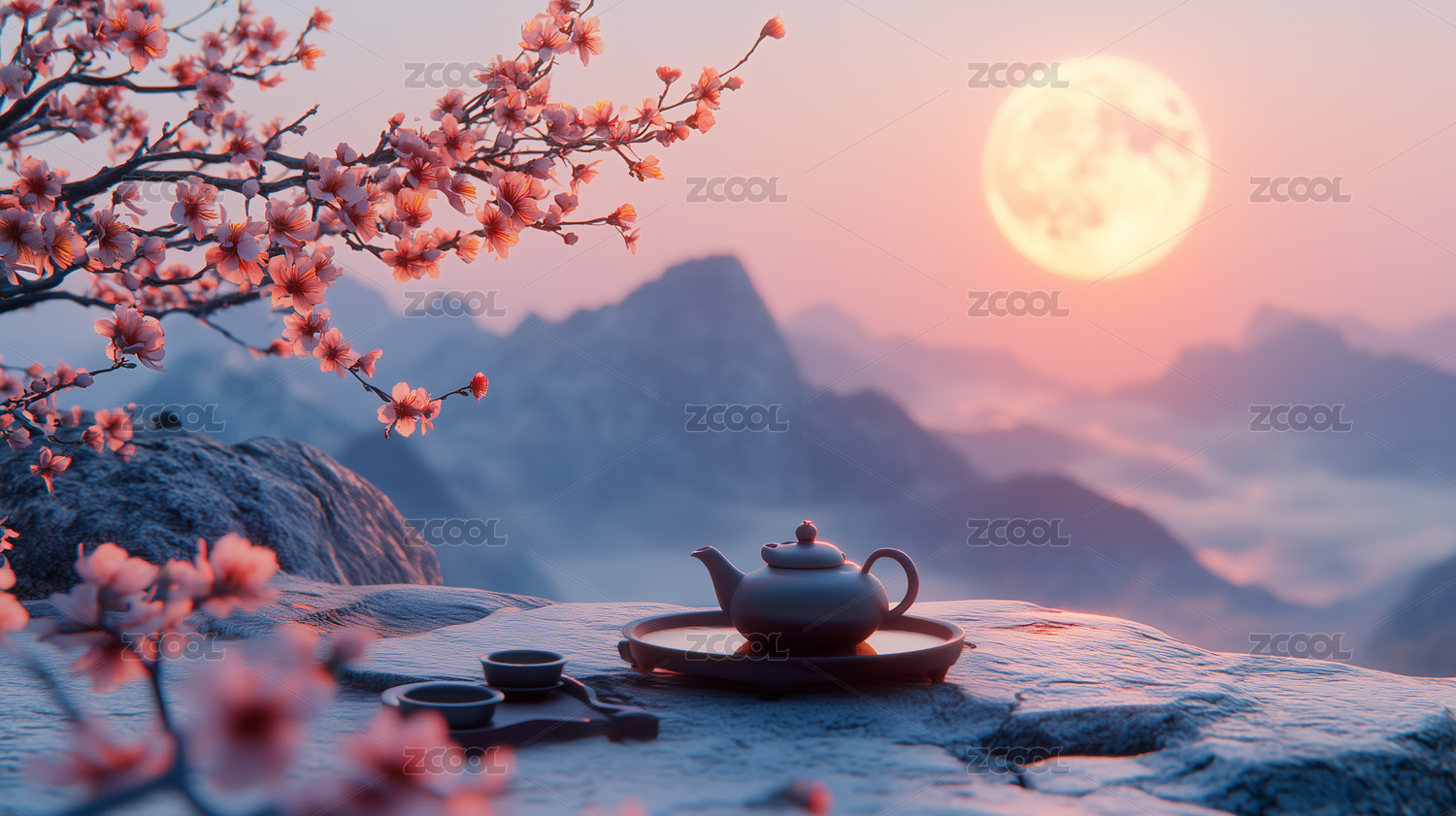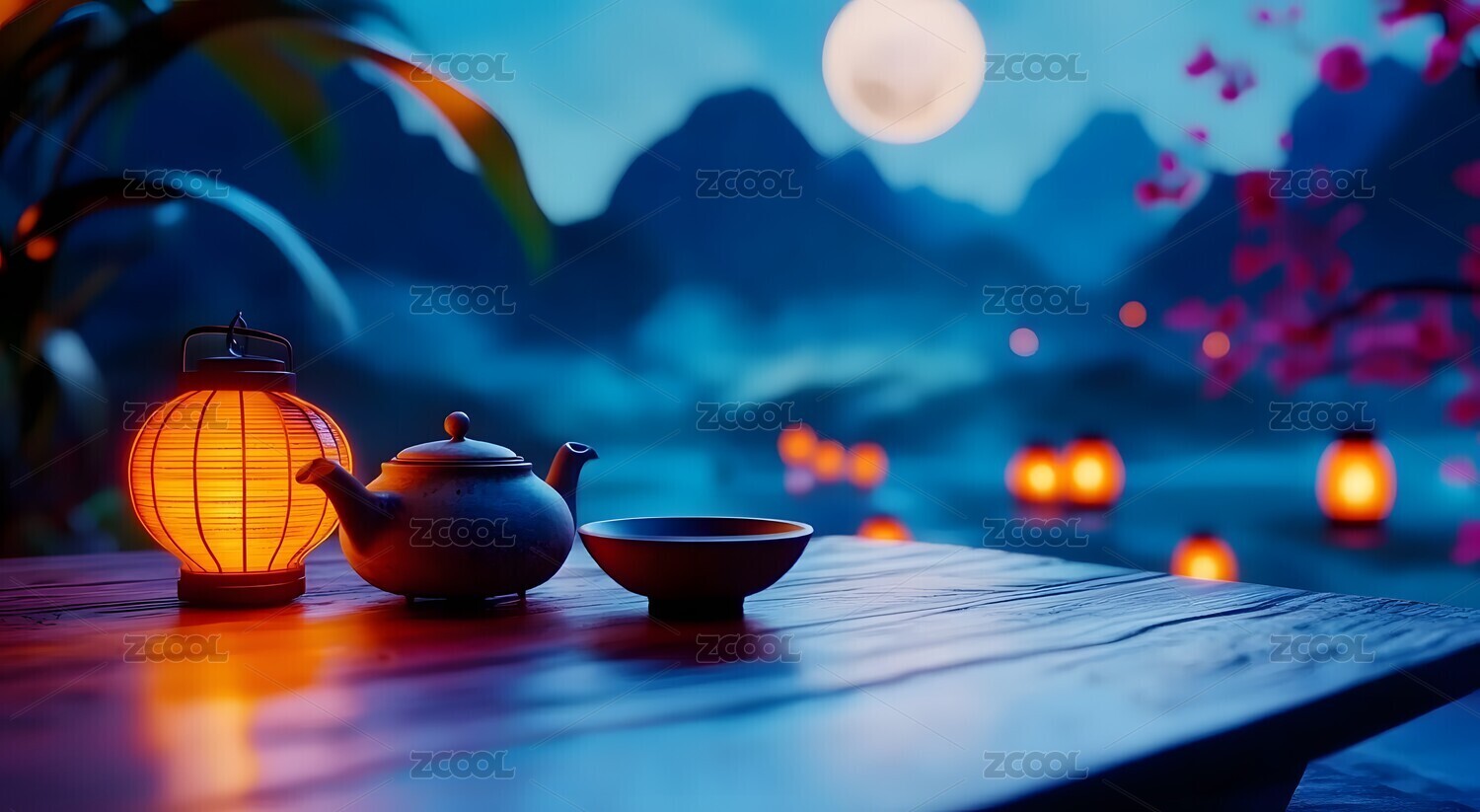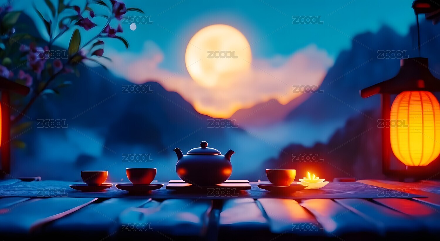 月下繁花旁的茶具与远山景致