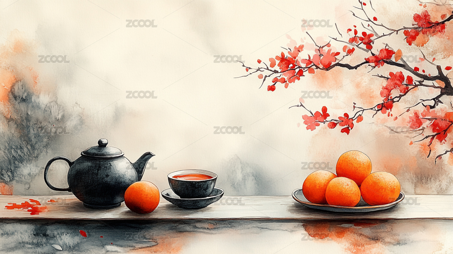 中式场景下红梅旁的古朴茶壶