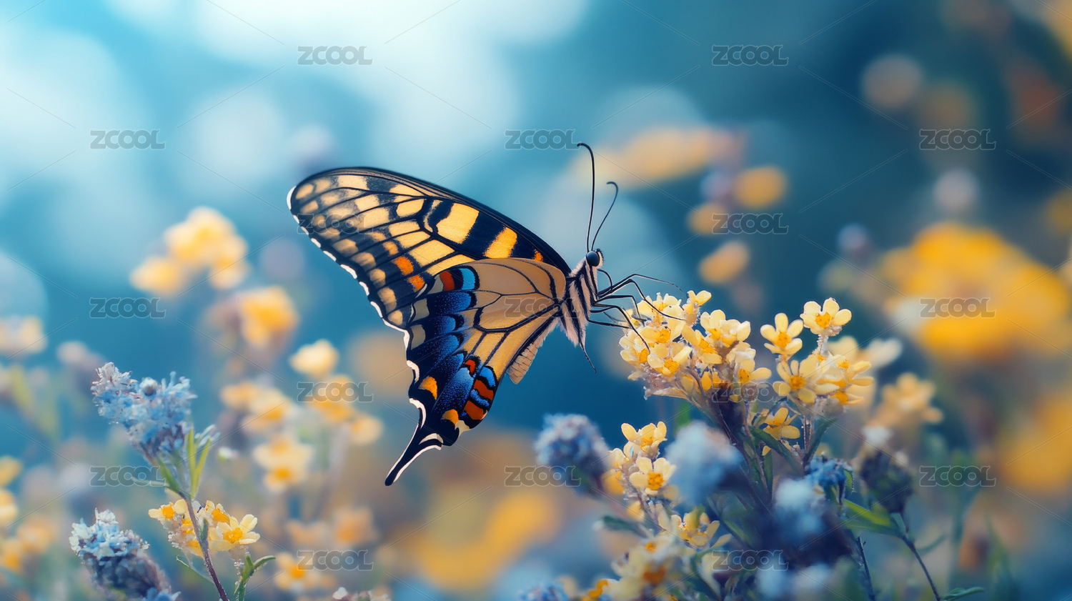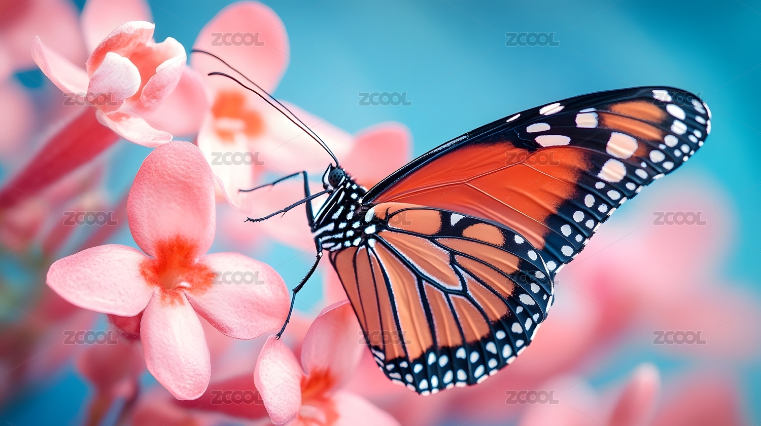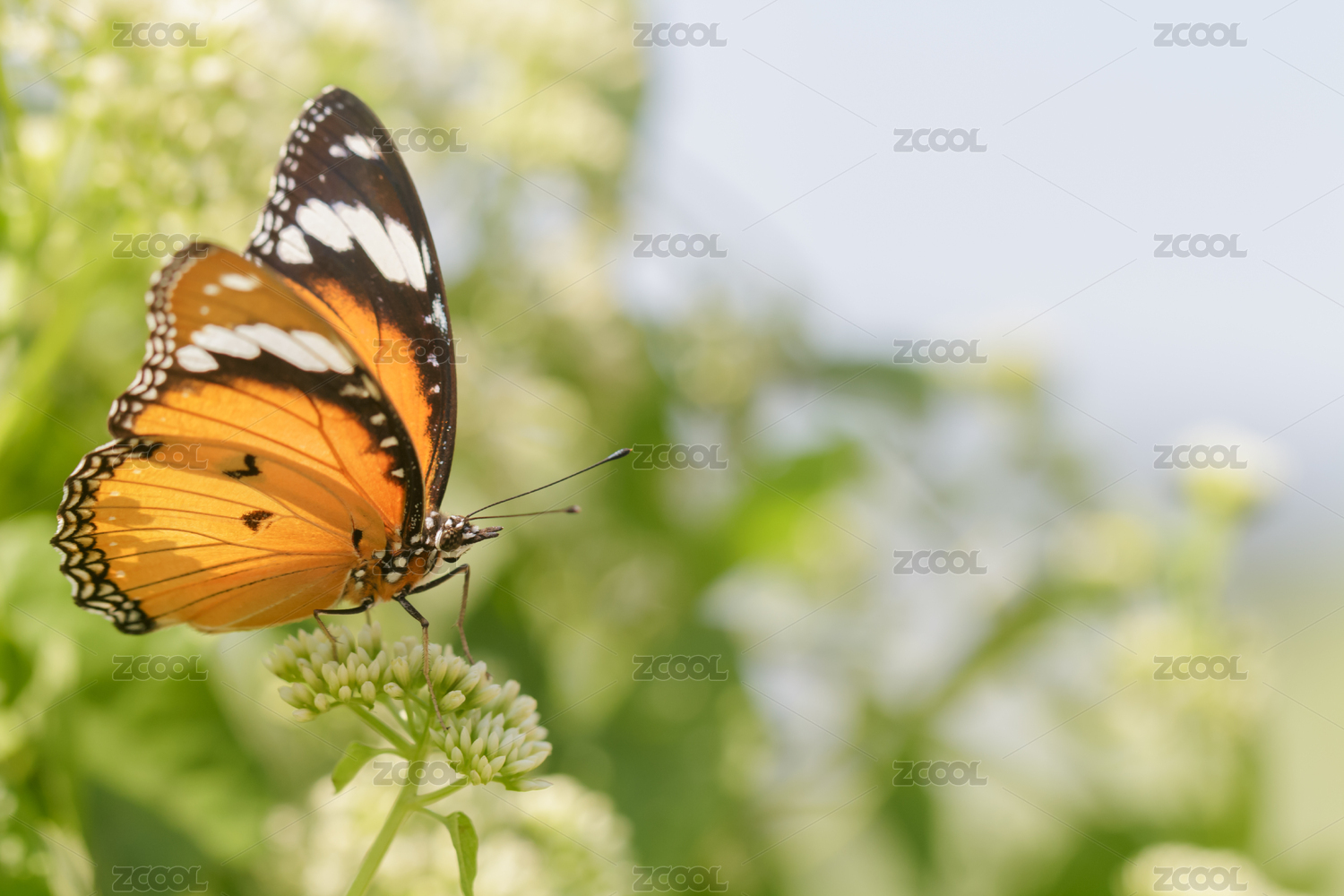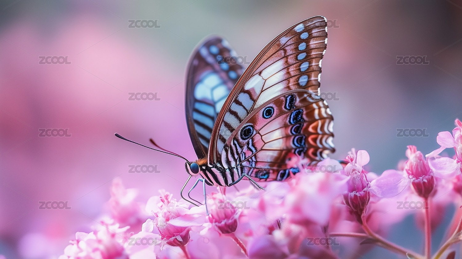 一只美丽蝴蝶栖息在花朵上授粉背景