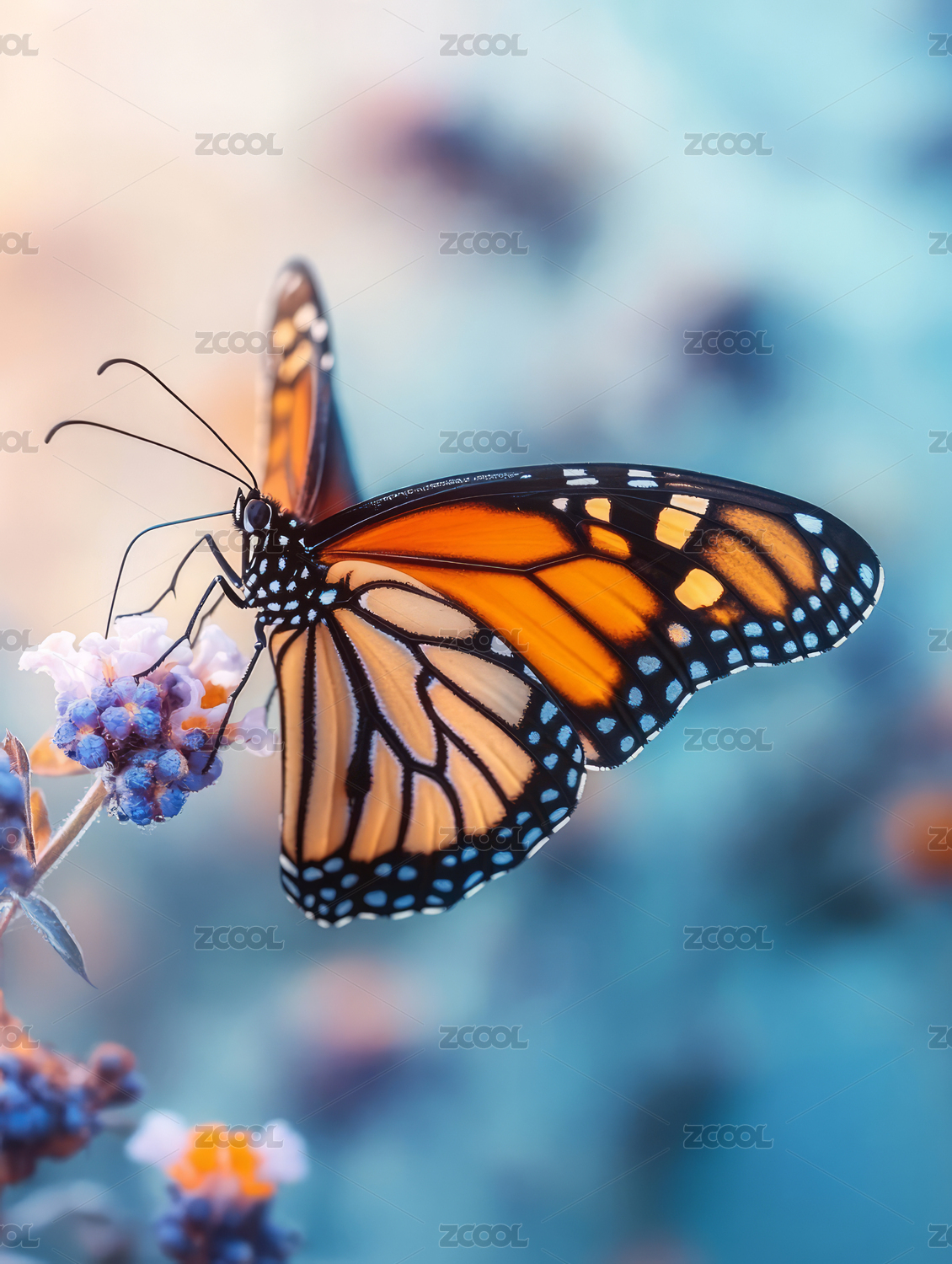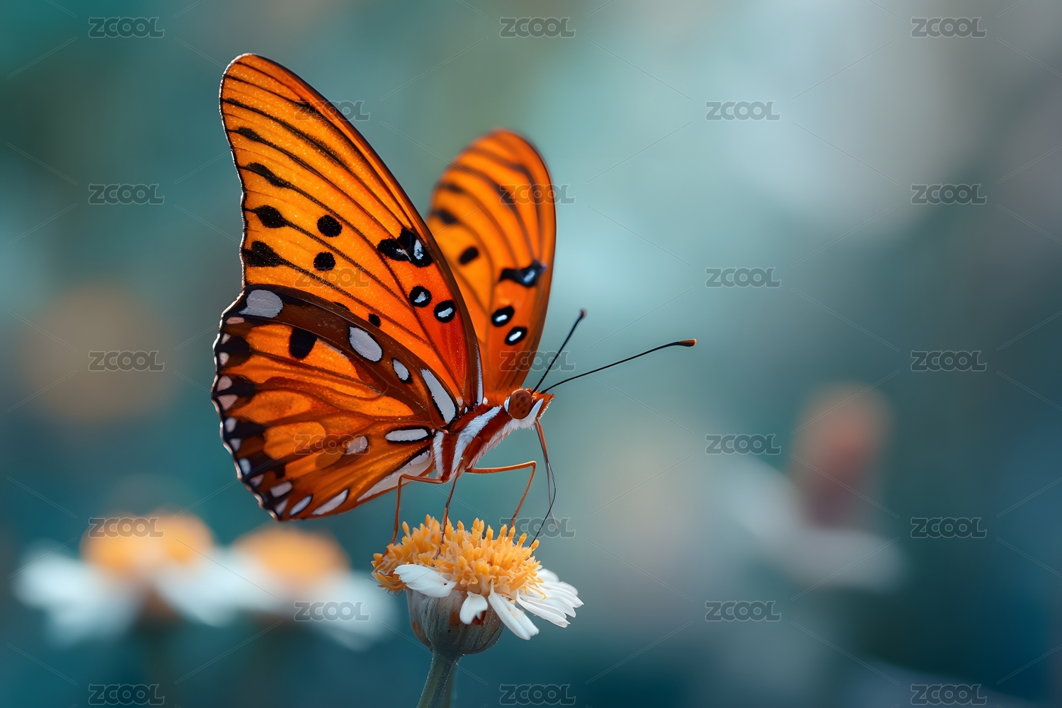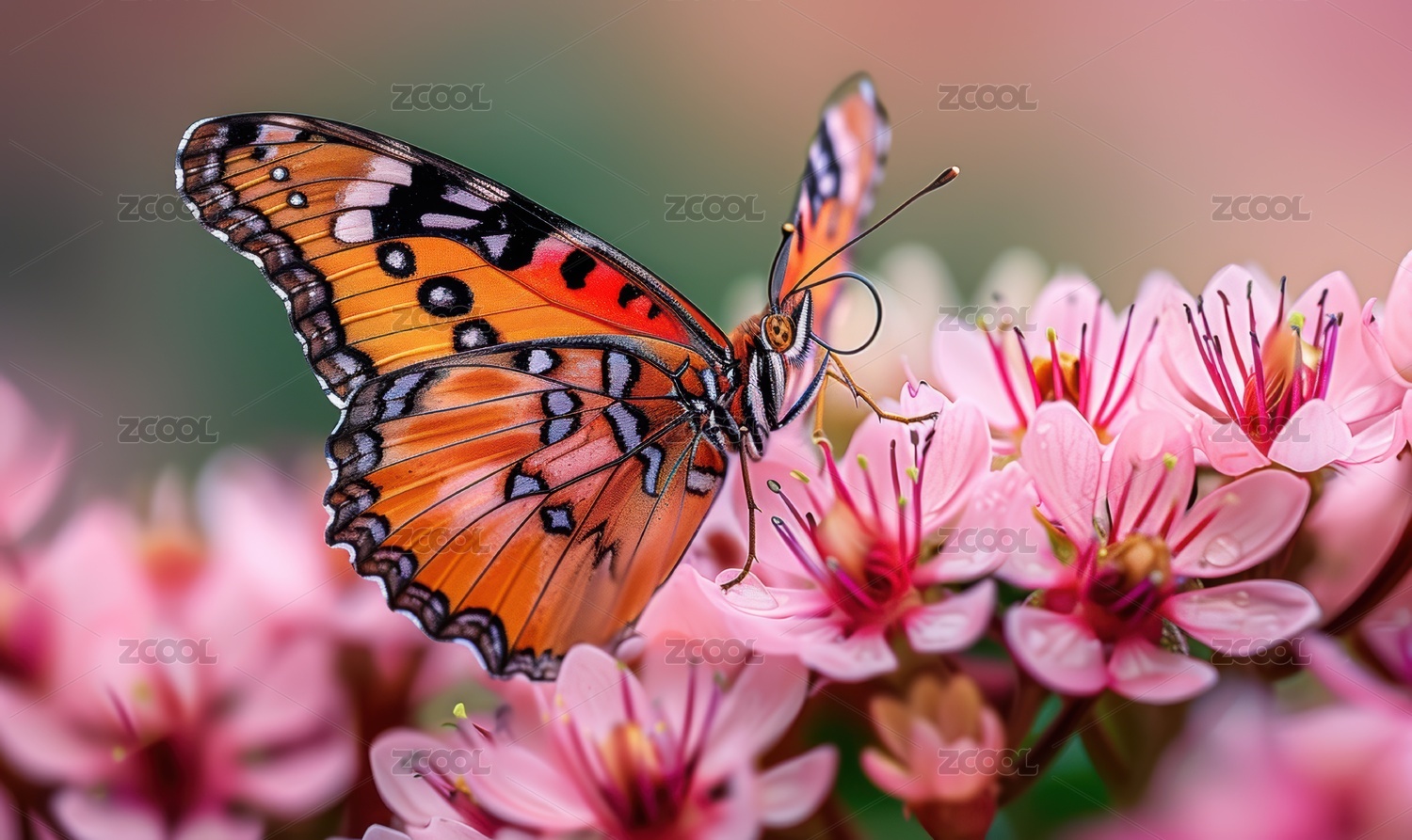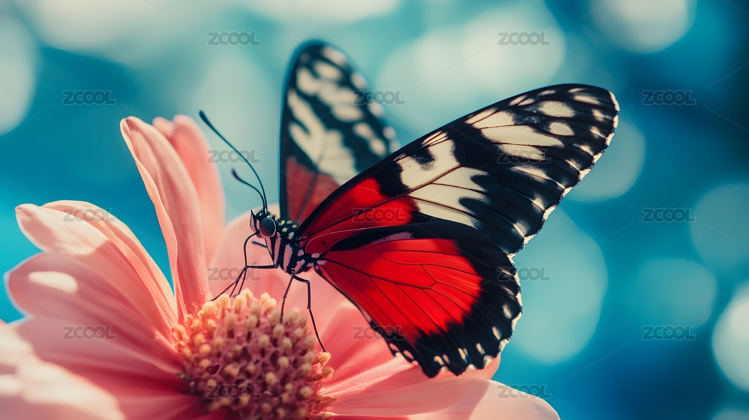 一只美丽蝴蝶栖息在花朵上授粉背景