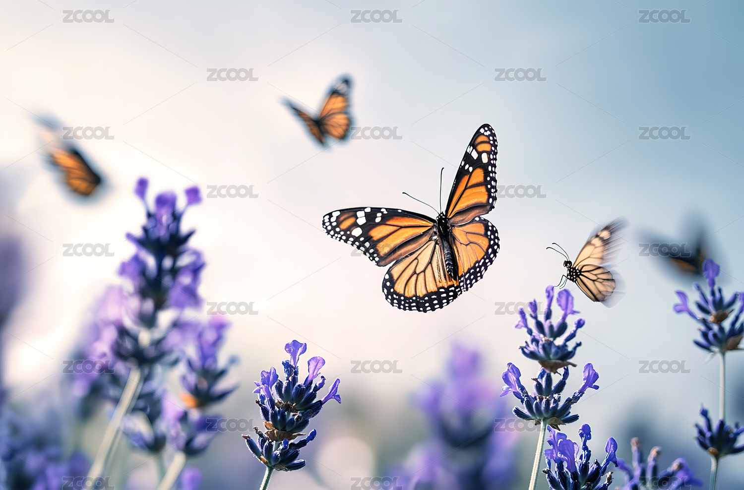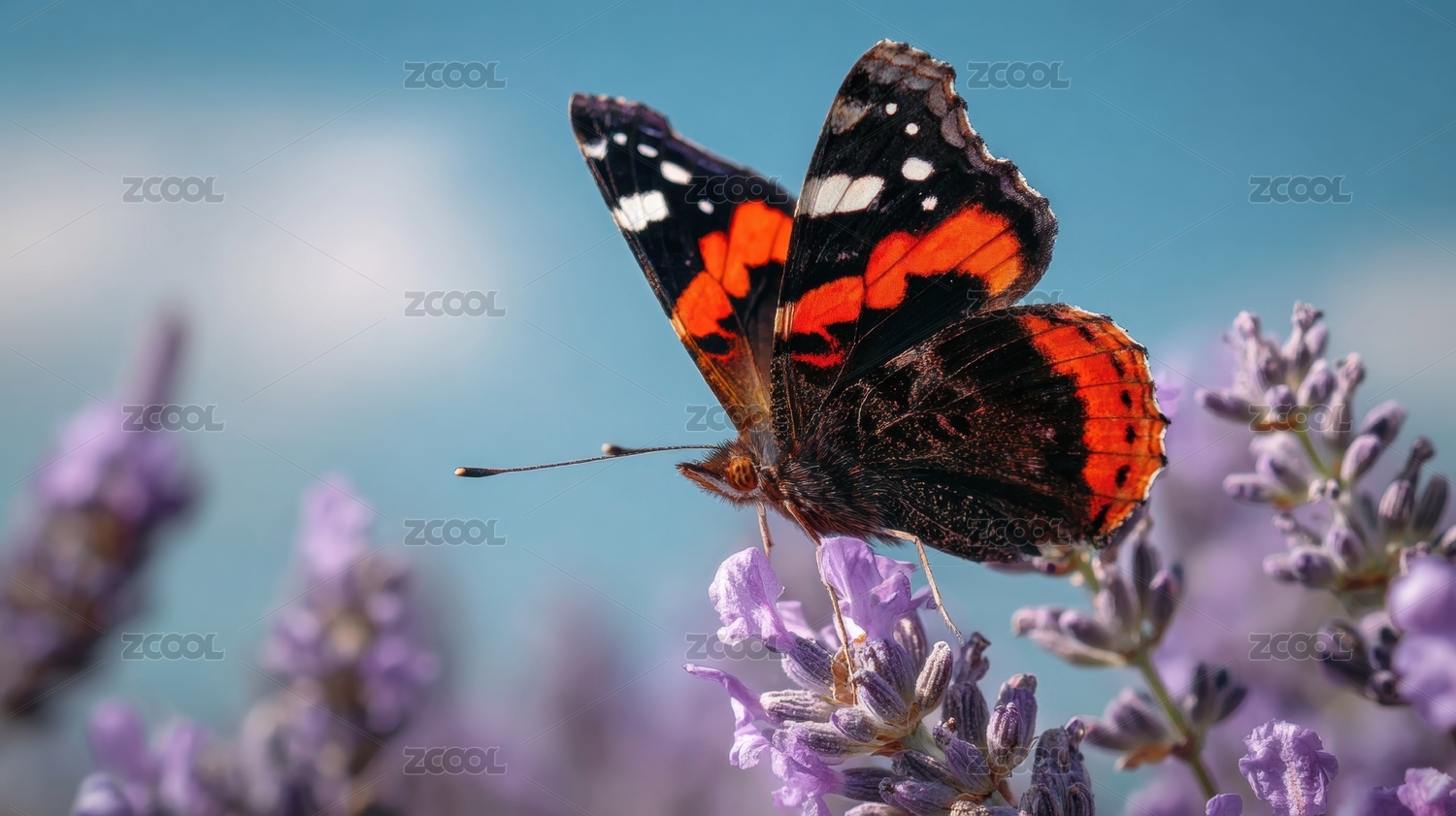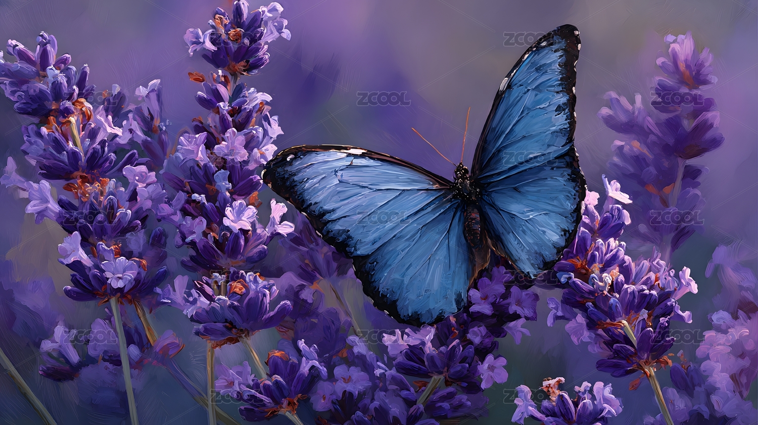 蓝蝴蝶停在薰衣草丛中 美丽唯美意境