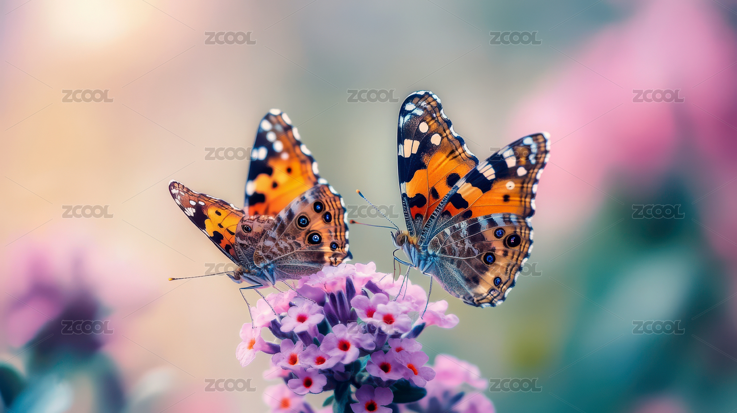 花园美丽花朵蝴蝶吸食花蜜春意自然背景