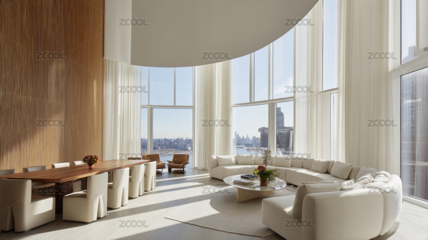 现代,公寓,客厅,城市,景观,大窗户,沙发,餐桌,阳光,高楼