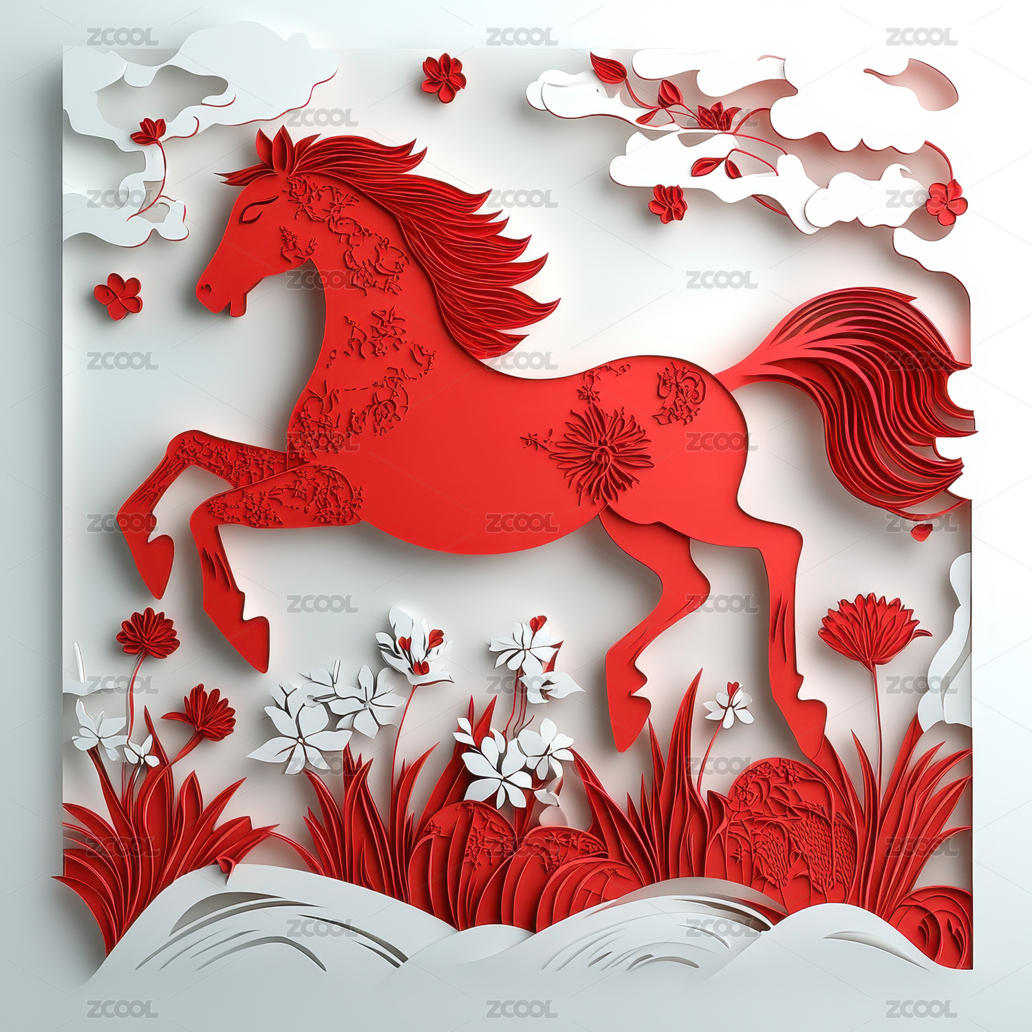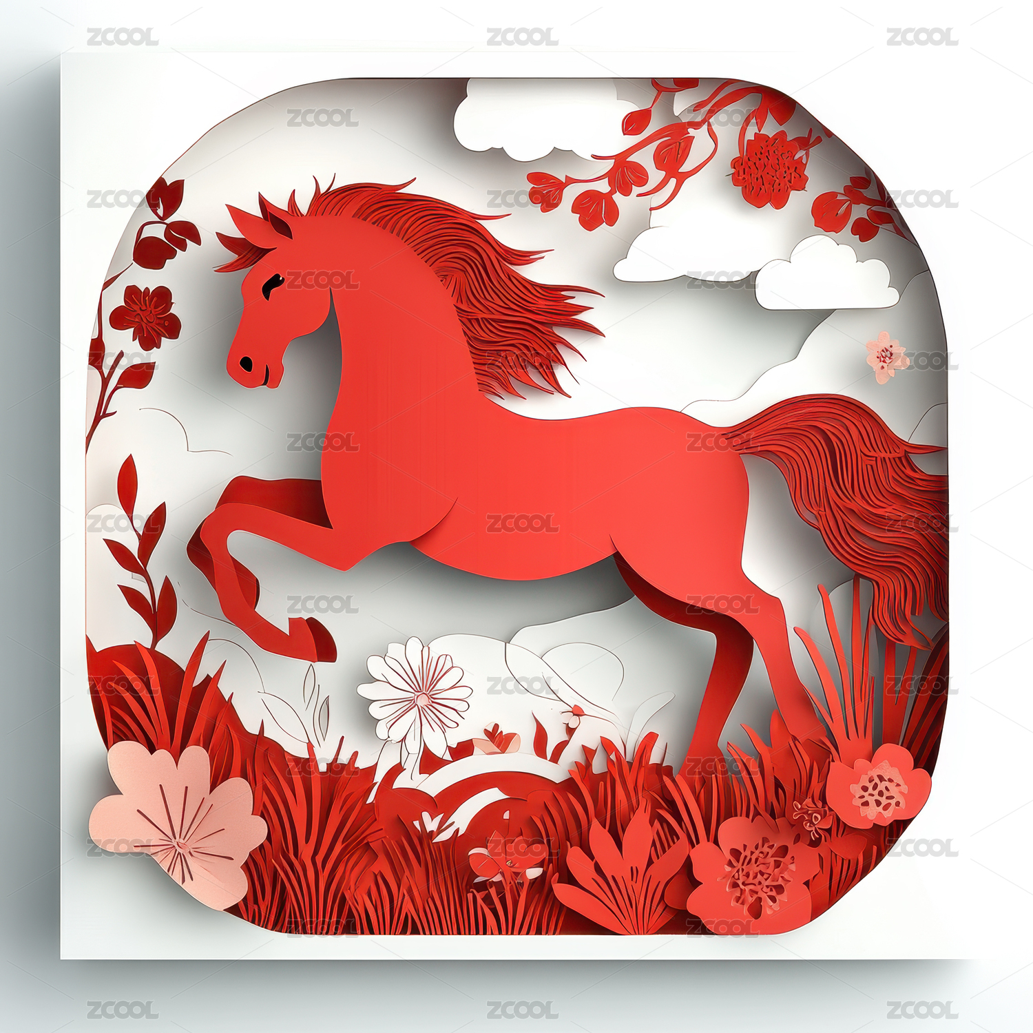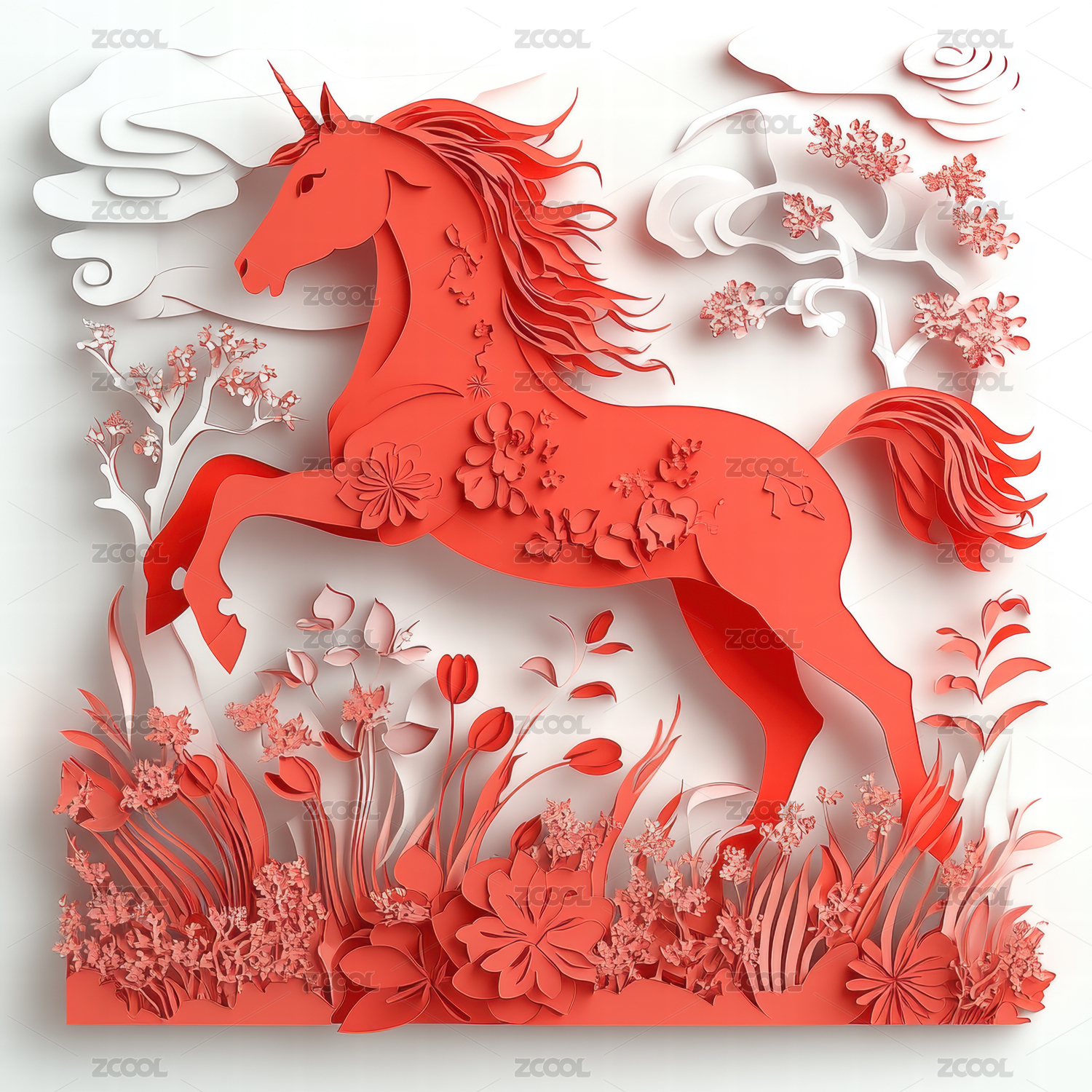 剪纸艺术风格奔跑的红马