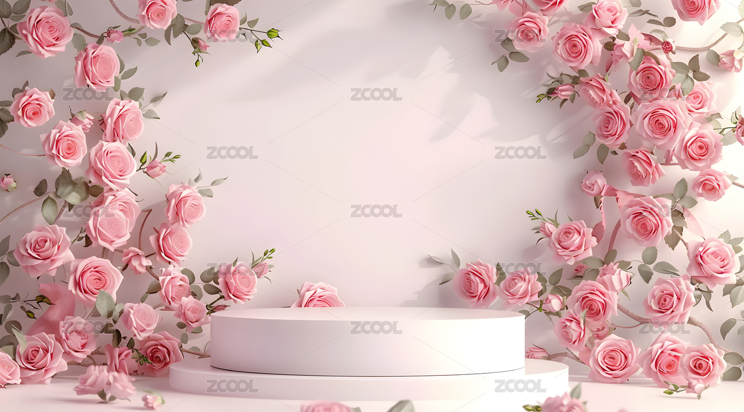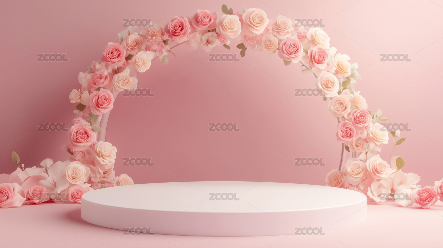 粉色玫瑰花环绕的圆形展示台