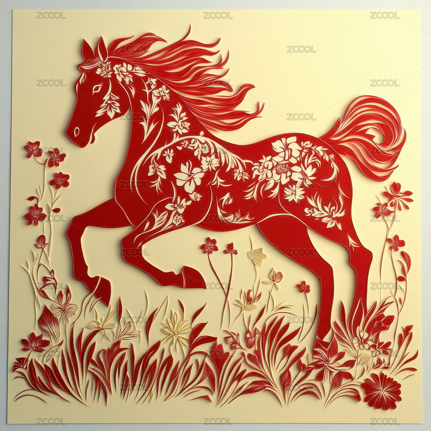 以中国剪纸艺术的风格奔跑的红马