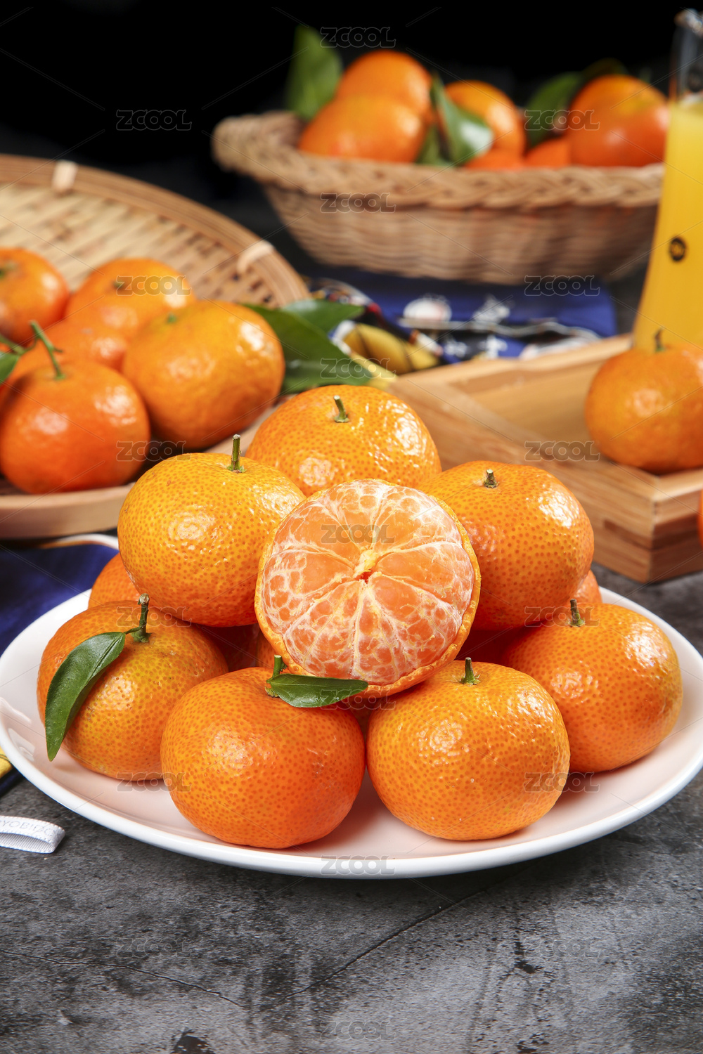 蓝子放着小蜜橘和剥皮的蜜桔果肉