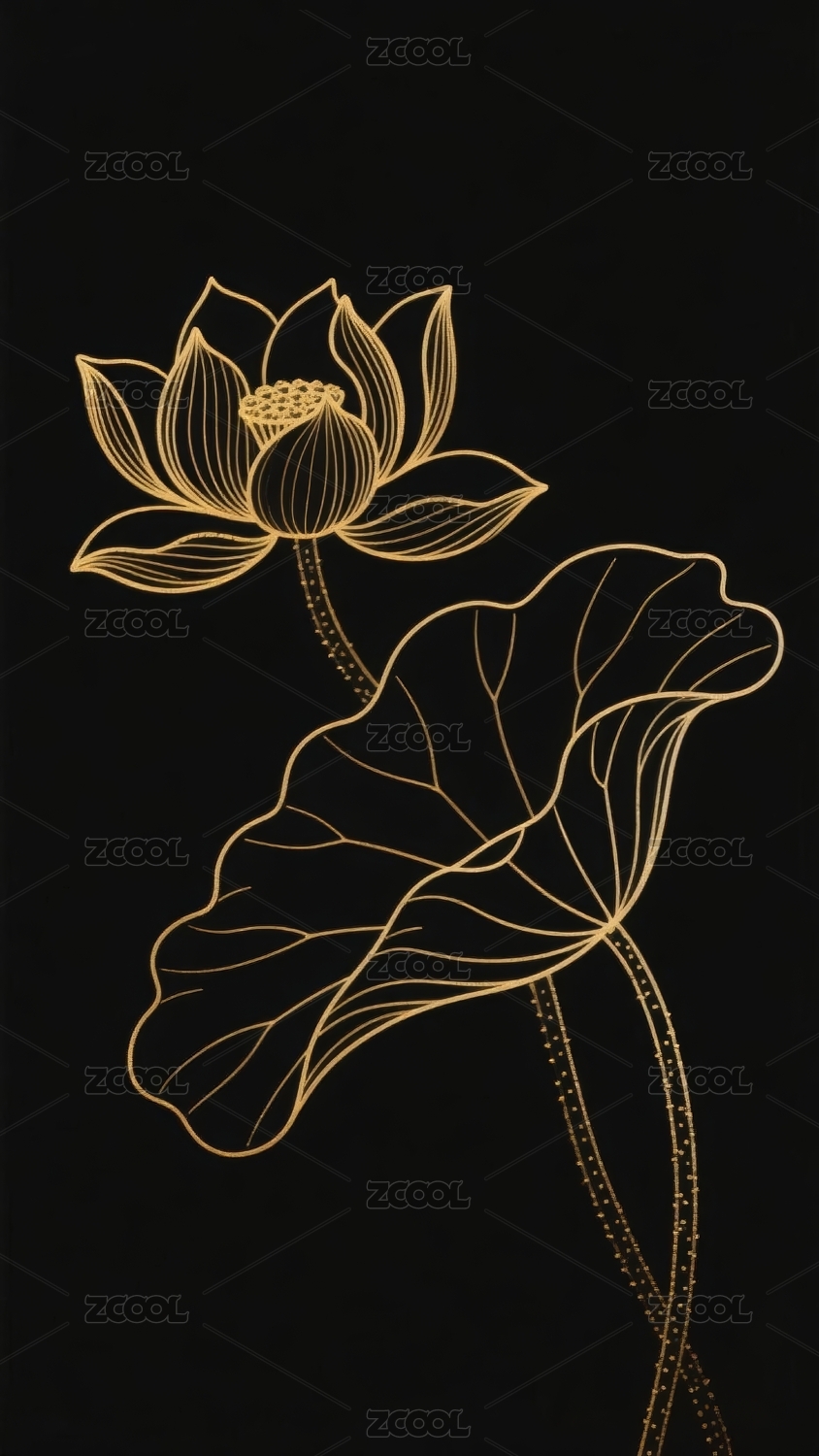 黑色,背景,线条,花蕊,花瓣,金色,莲花,莲蓬,茎秆,莲叶