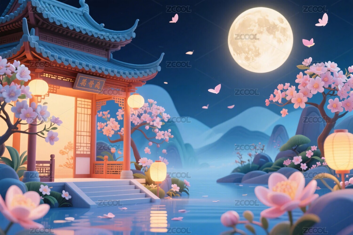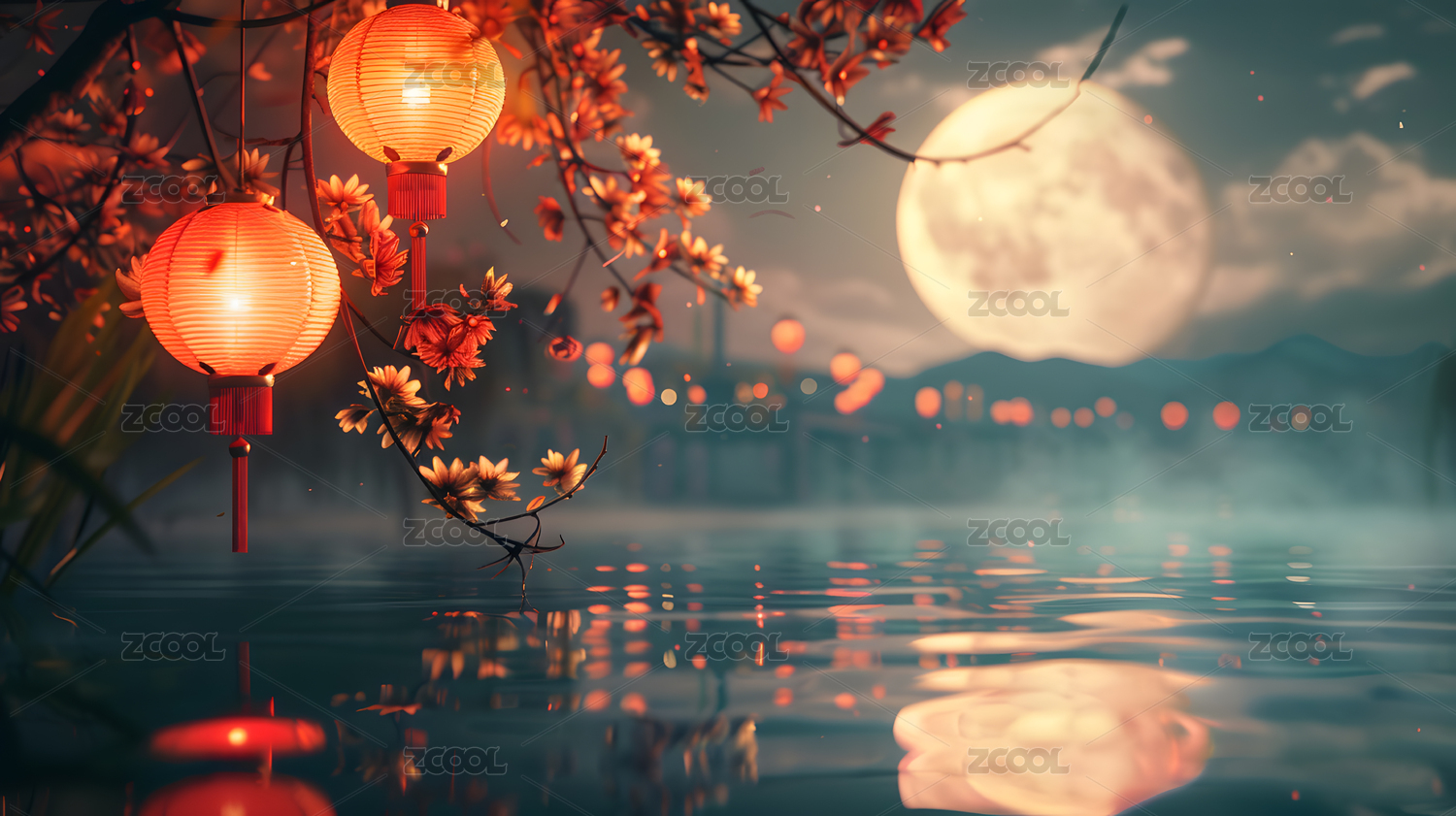 中秋节,赏月,月亮,庭院,中国风,红灯笼,团圆,祥和,静谧,古风