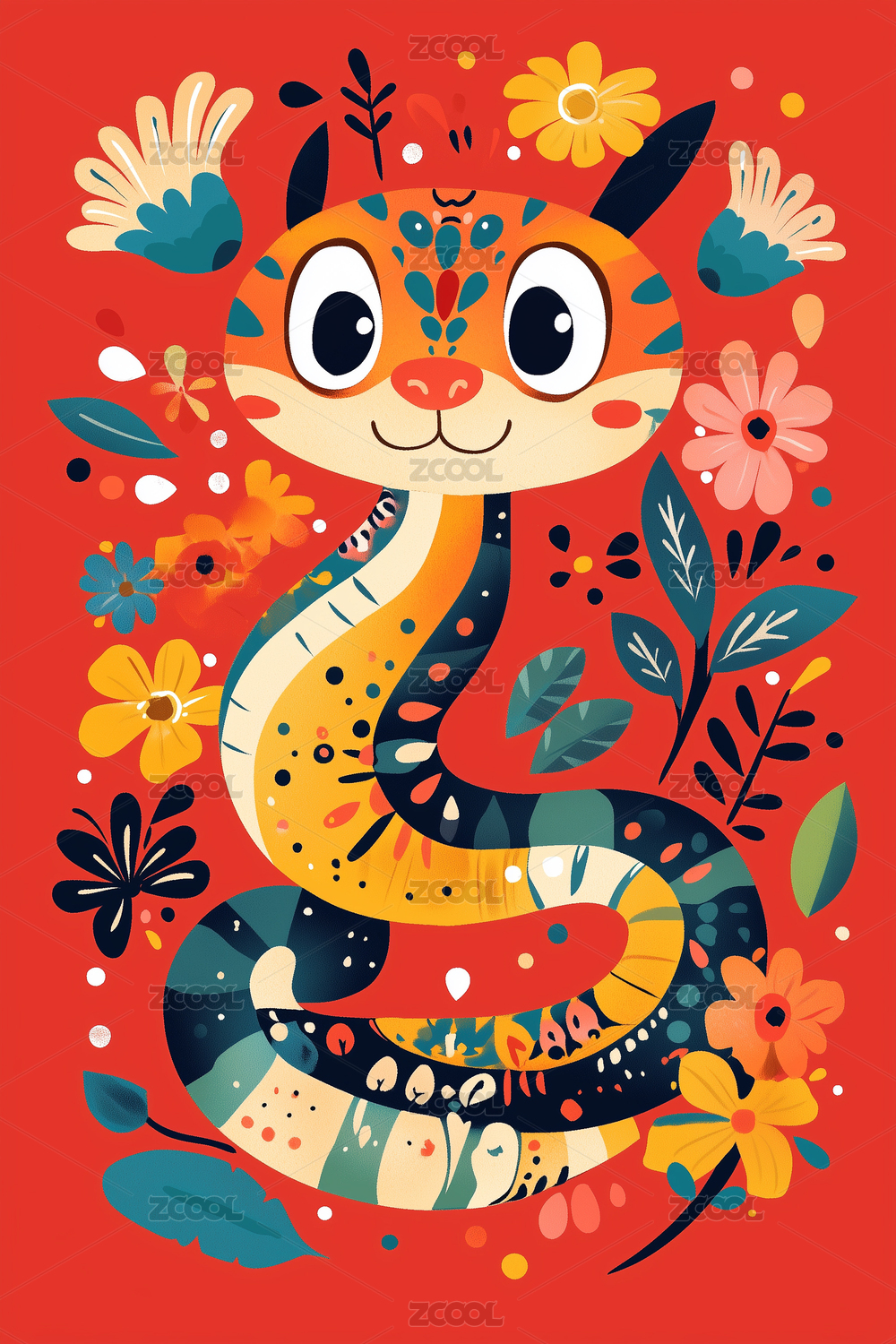 多彩的花卉图案可爱的生肖蛇插图