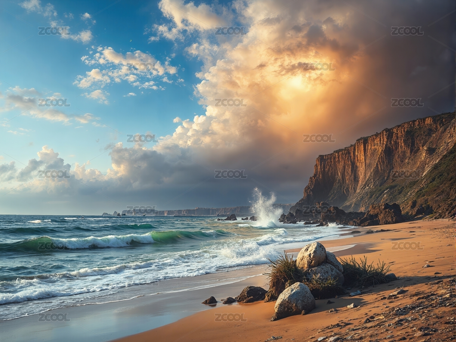 夕阳下的海浪沙滩