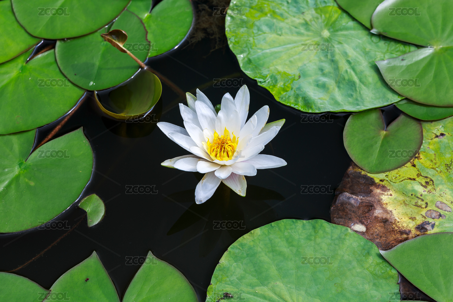 夏天池塘里绿色叶子中间盛开的一朵白色的睡莲花