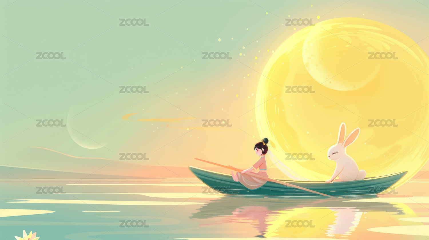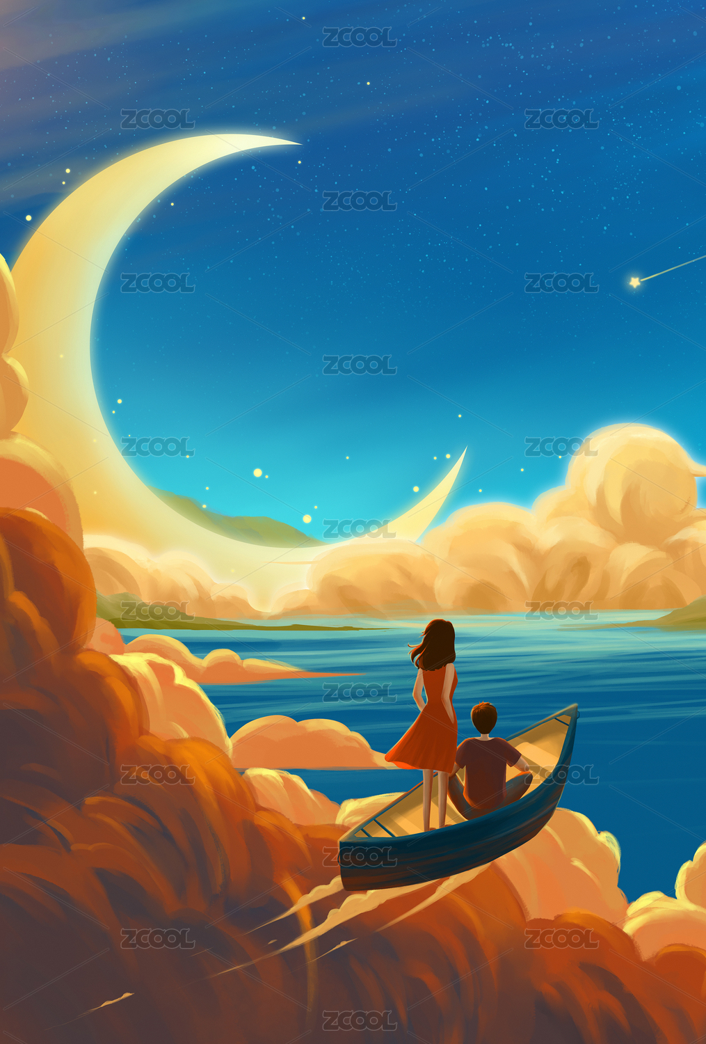 中秋节之夜情侣坐在云朵的船上望着月亮 云朵上的星星梦幻中秋节插画