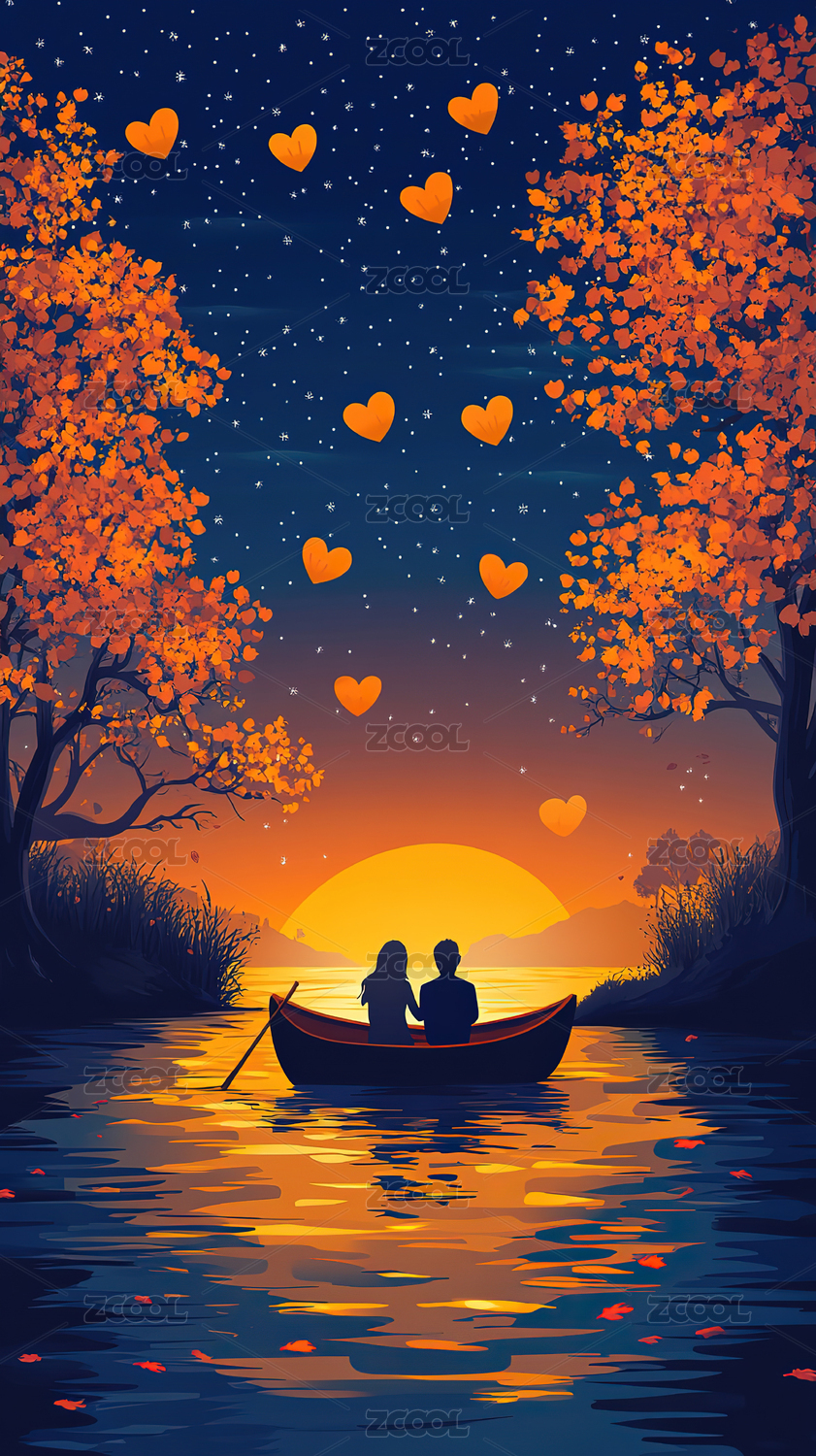 月亮下情侣坐在船上放孔明灯和花灯许愿插画