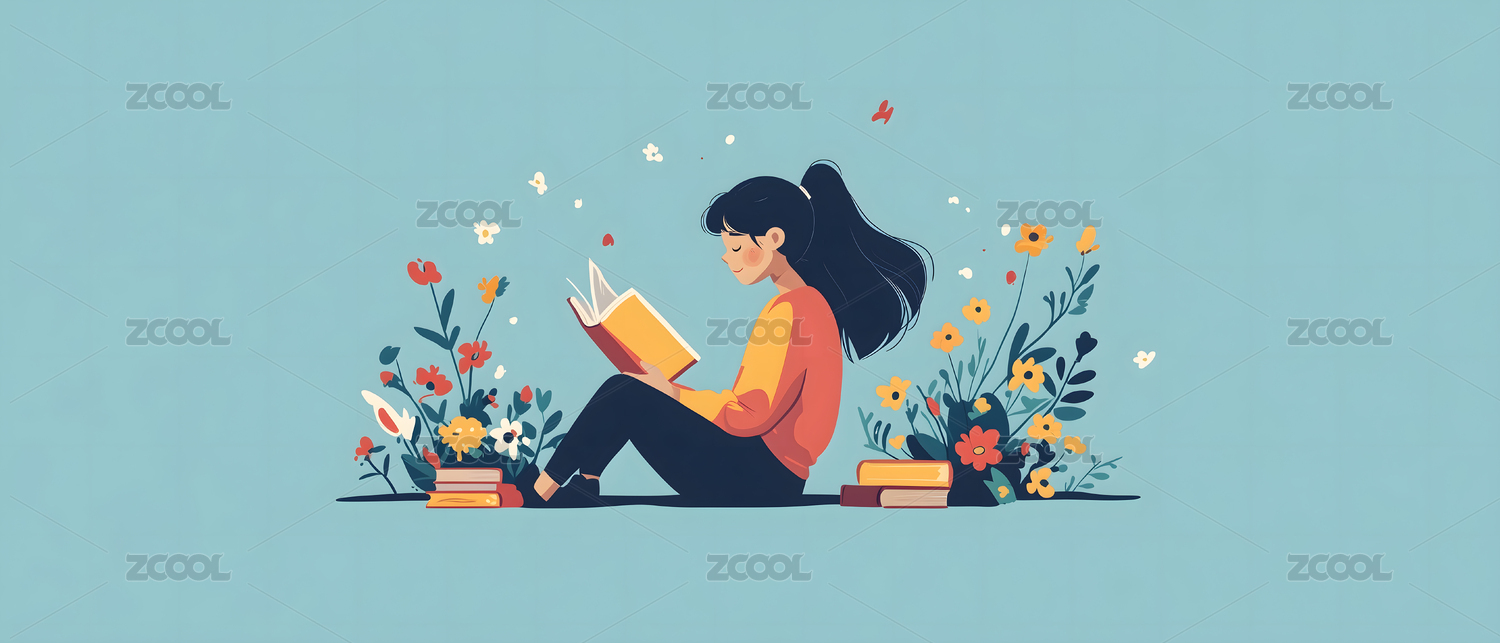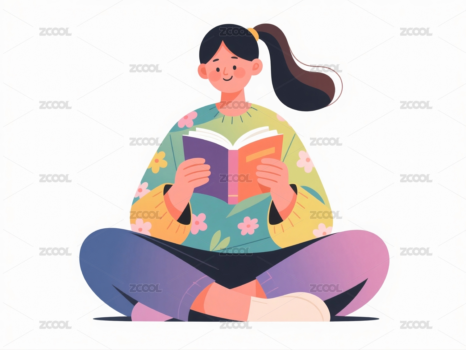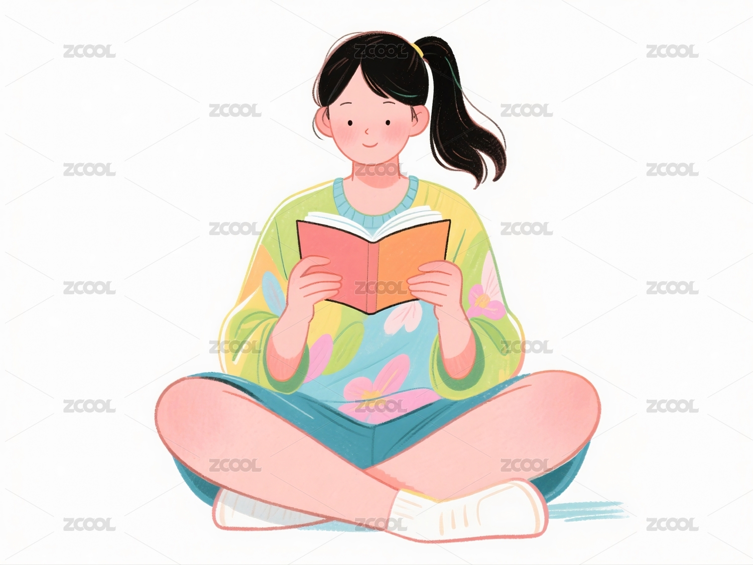 一个小女孩坐在室内沙发上看书 手绘矢量插