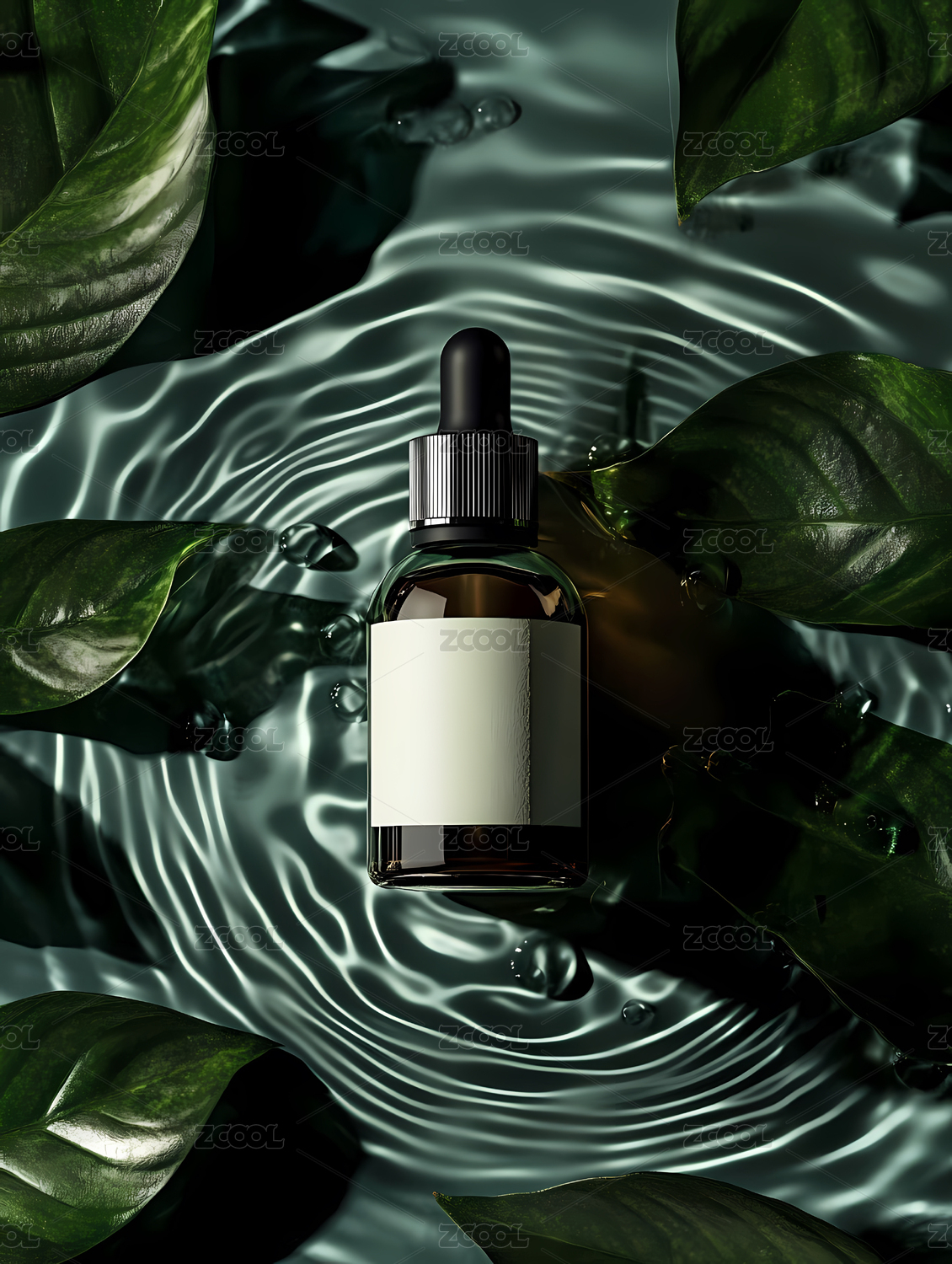 玻璃滴管瓶置于水波与绿叶间