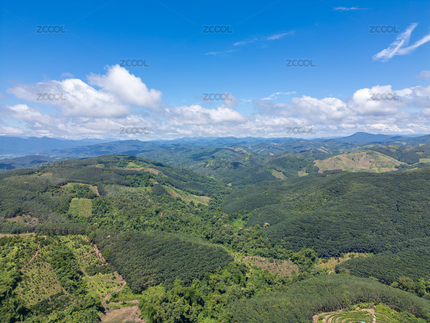 航拍蓝天白云下广阔无垠绿意盎然的山地景观