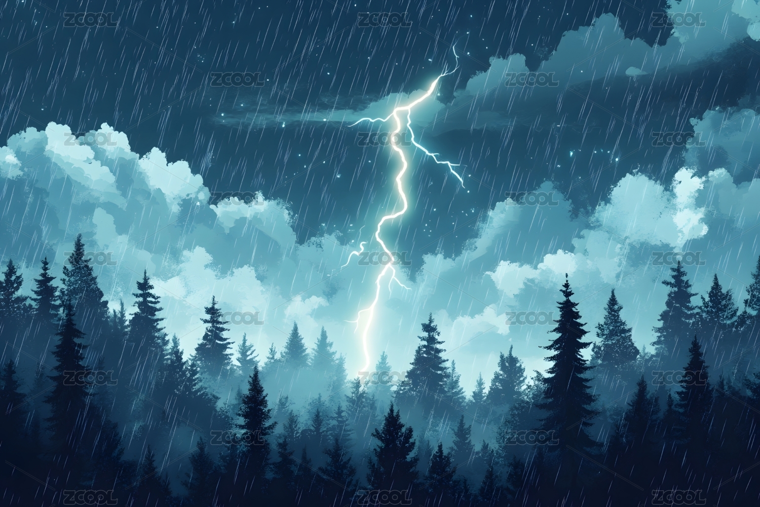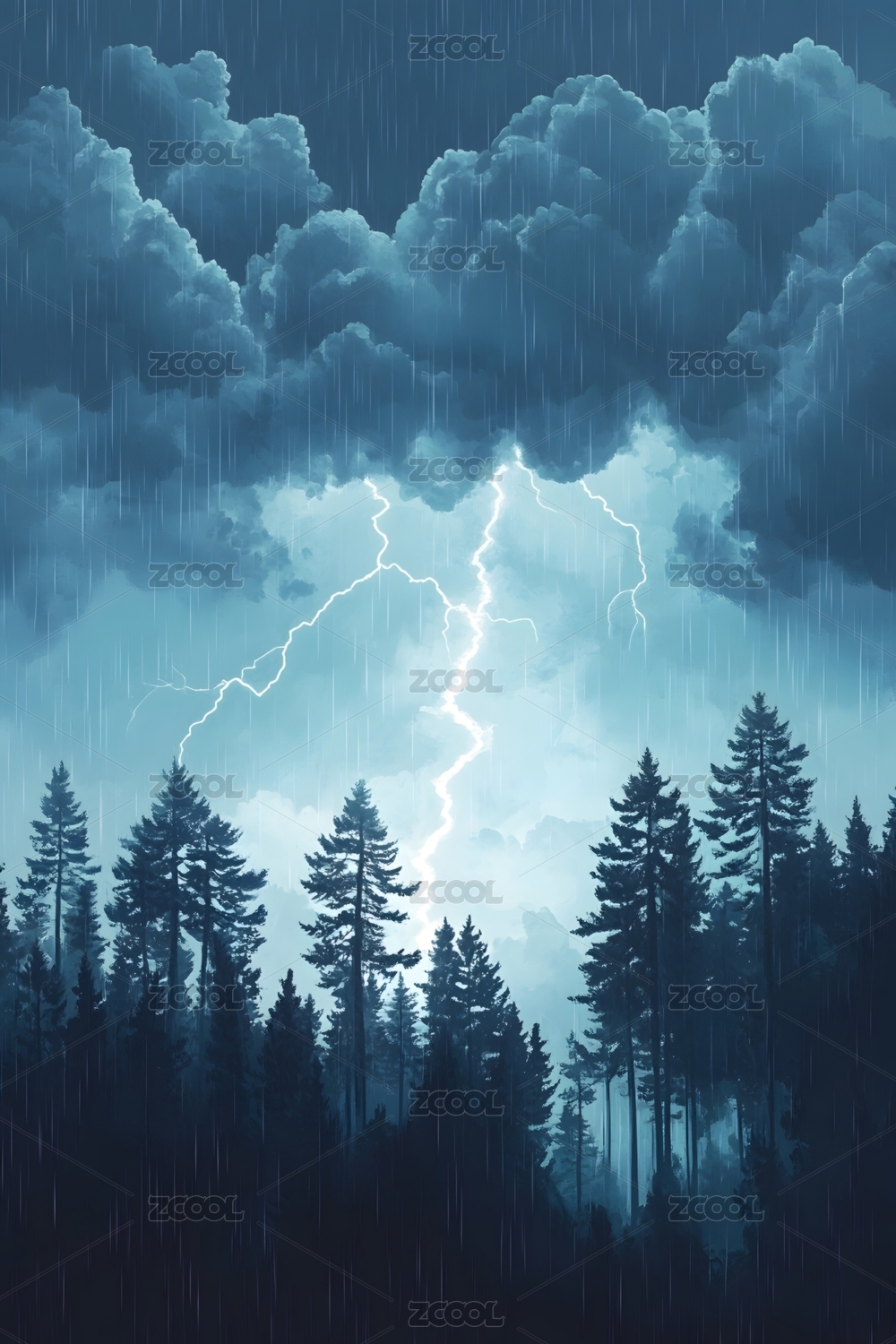雨中闪电山峦倒影