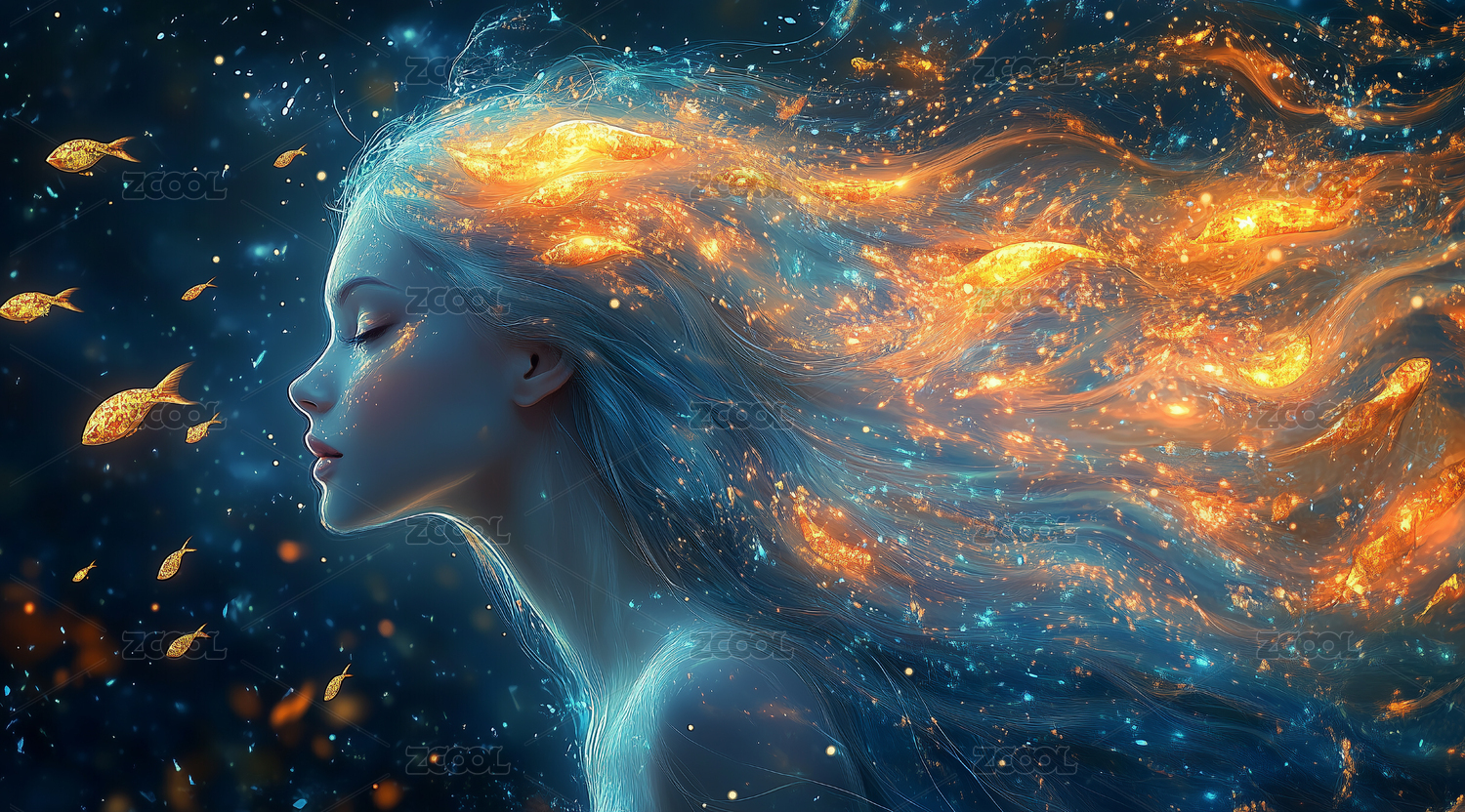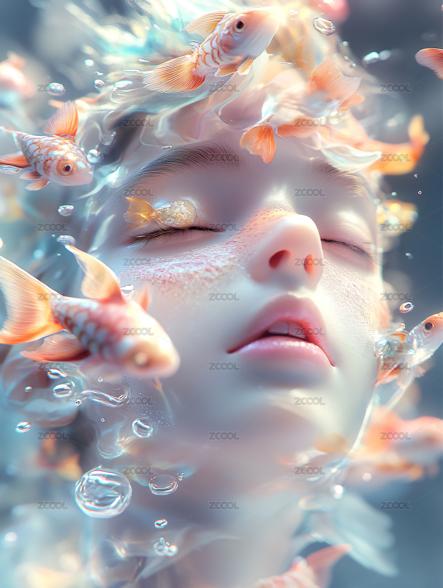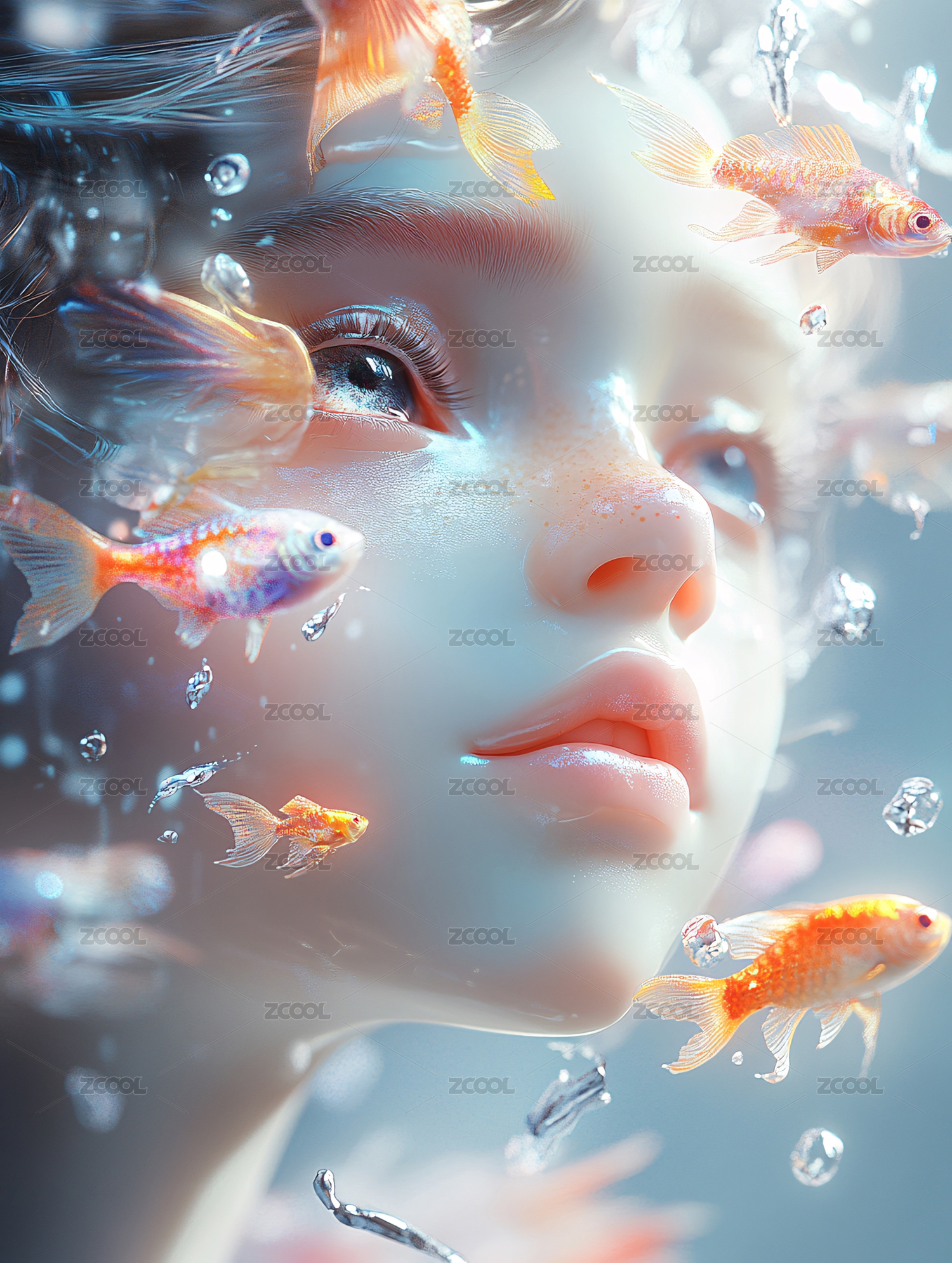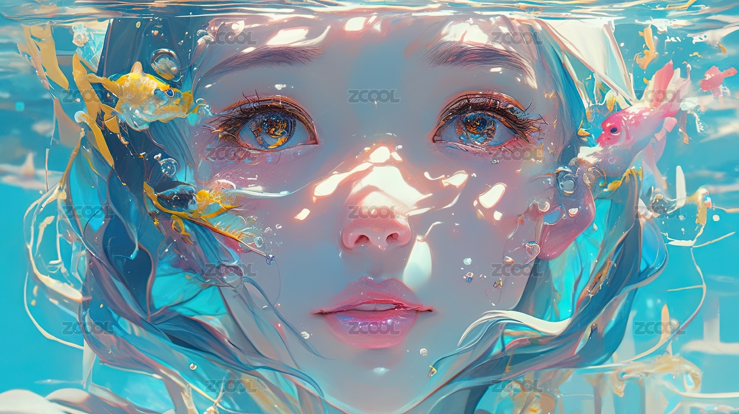 光影,插画,水,精致,海洋,平静,女孩,梦幻,色彩,金鱼