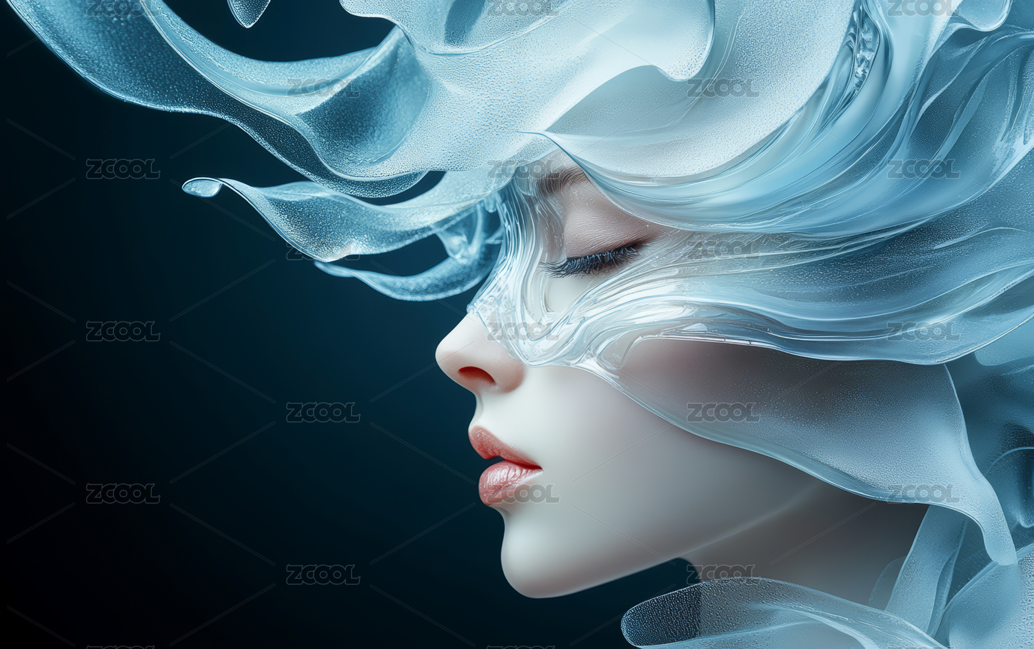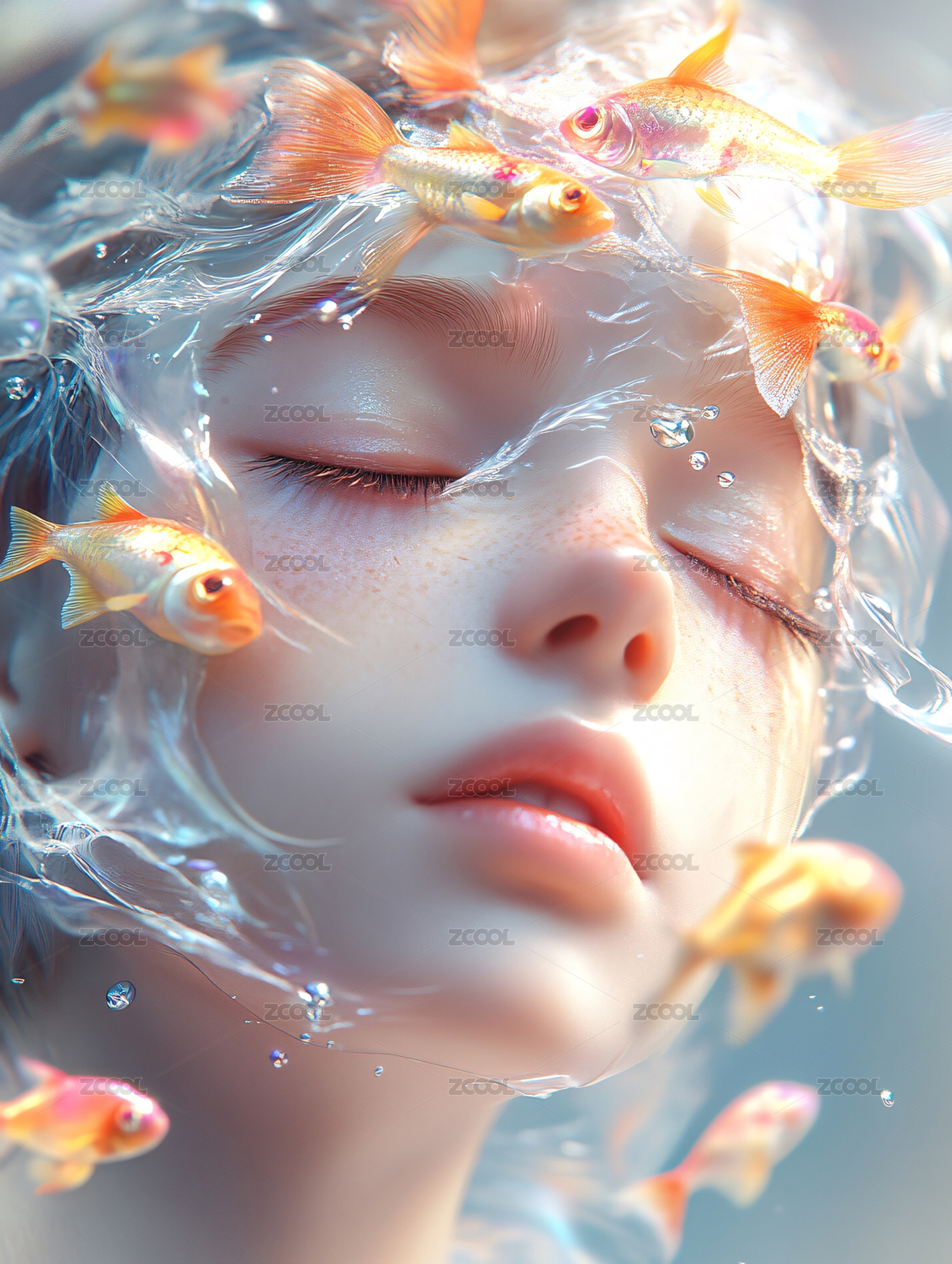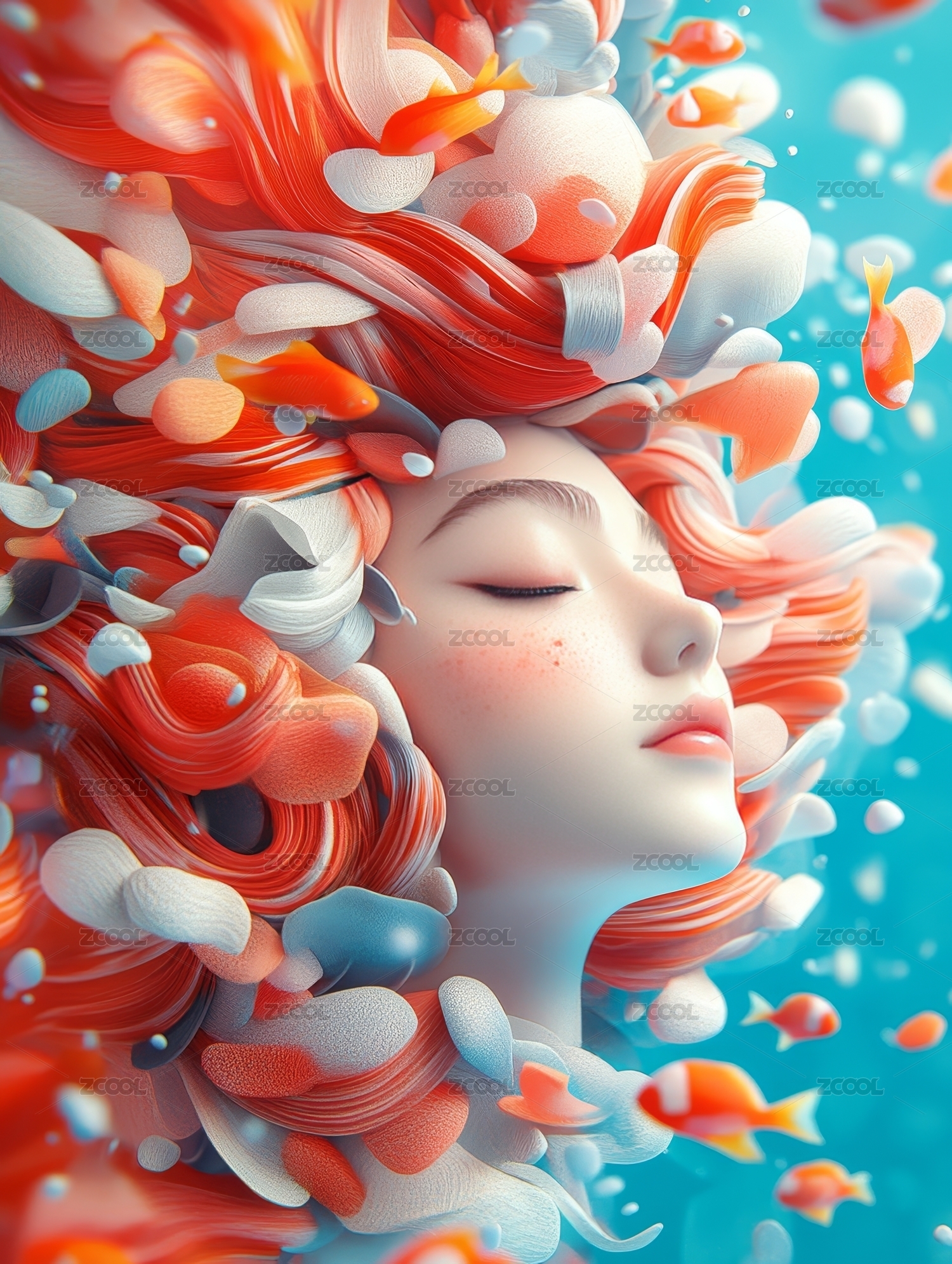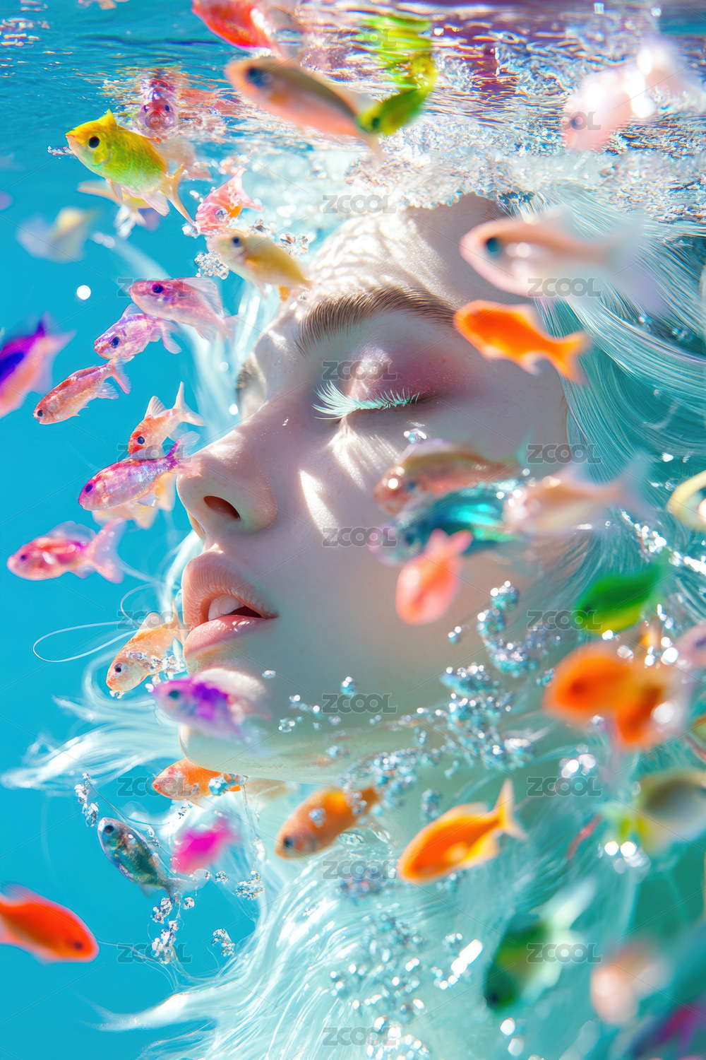 光影,插画,水,精致,海洋,平静,女孩,梦幻,色彩,金鱼