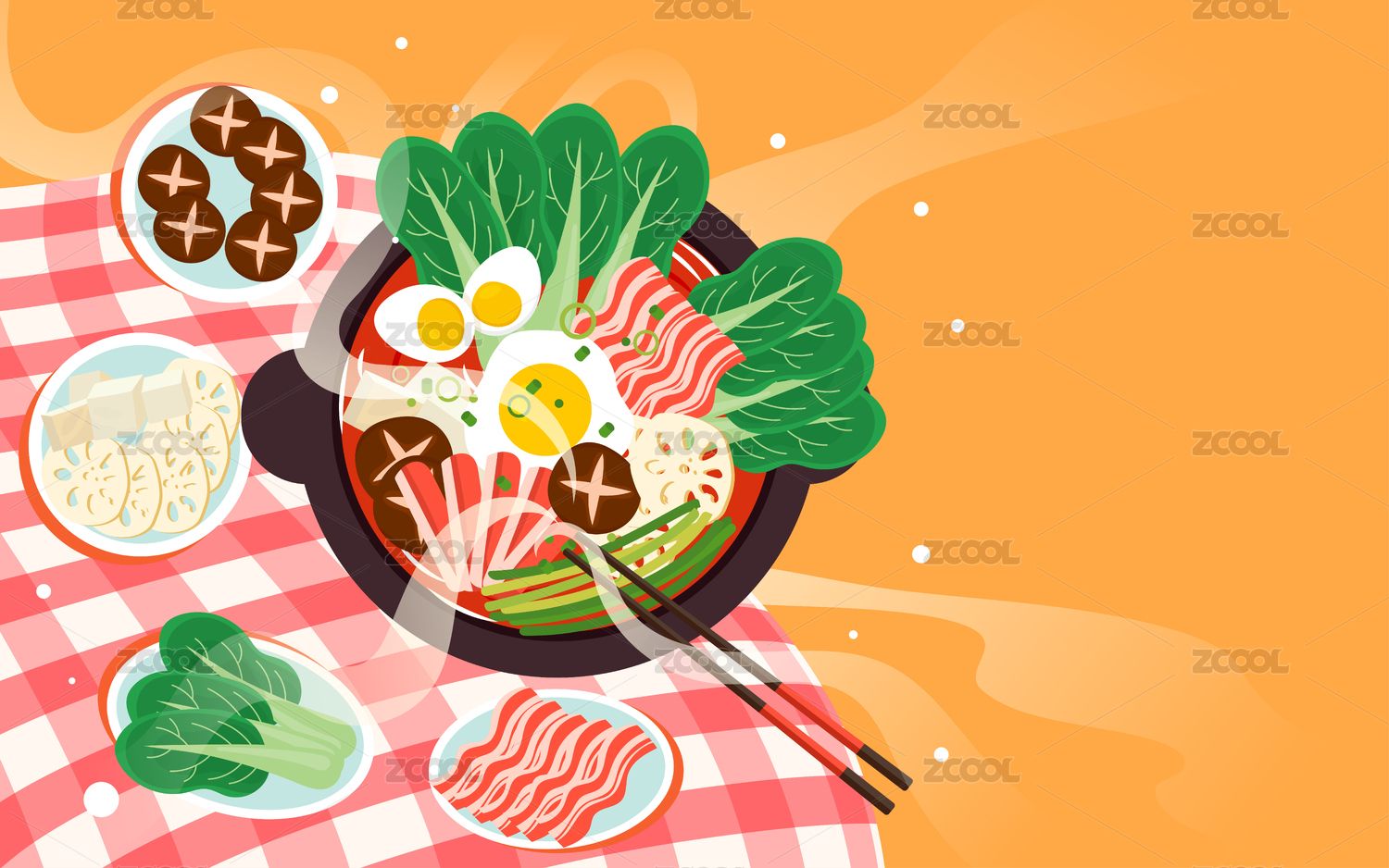 火锅食材背景海报庆祝春节年夜饭美食插画