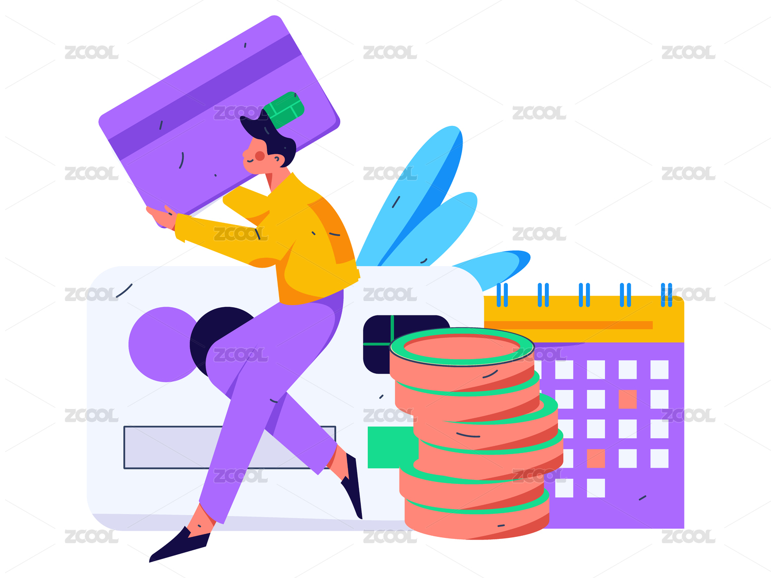 卡通手绘男人手持金币财富赚钱网络经济上涨插画
